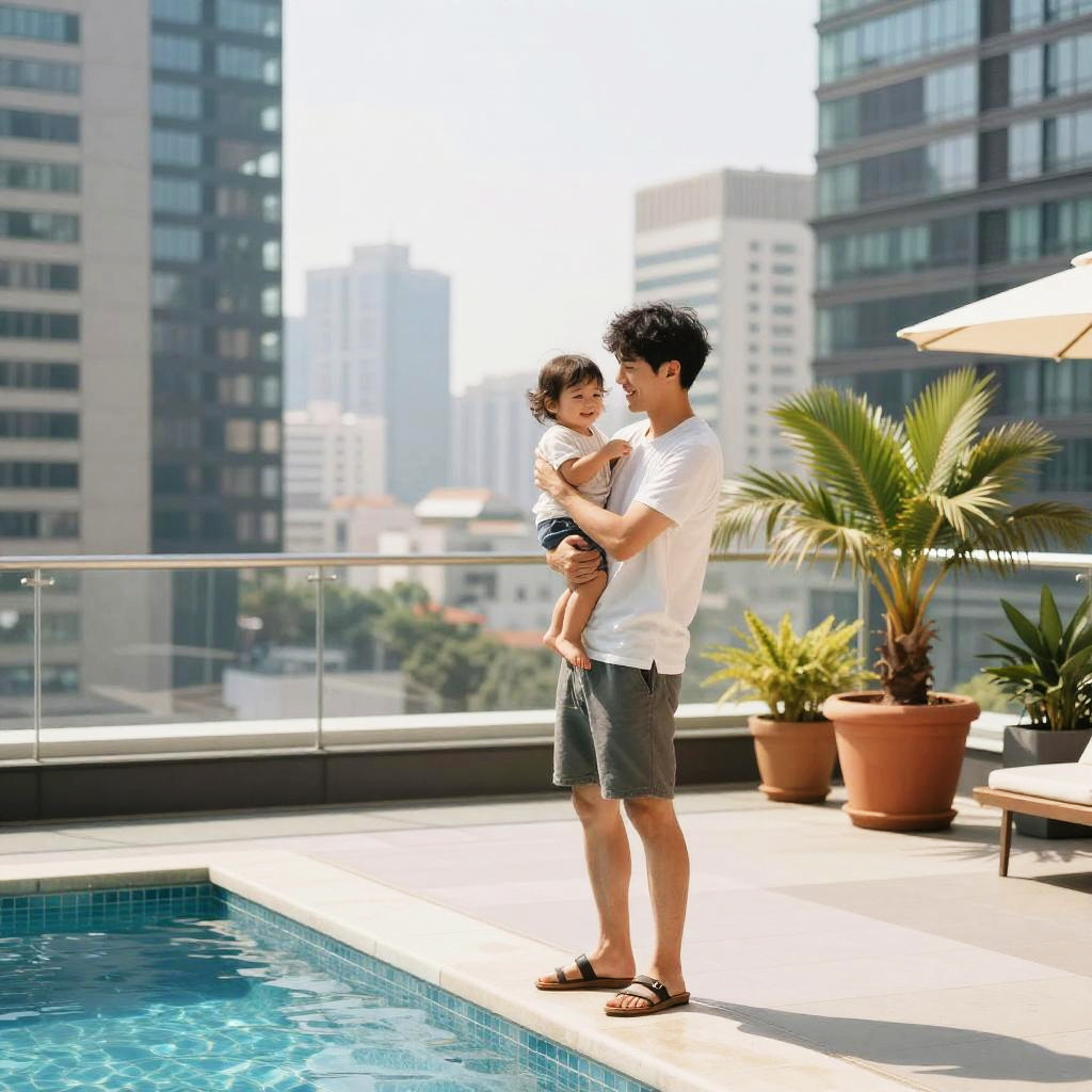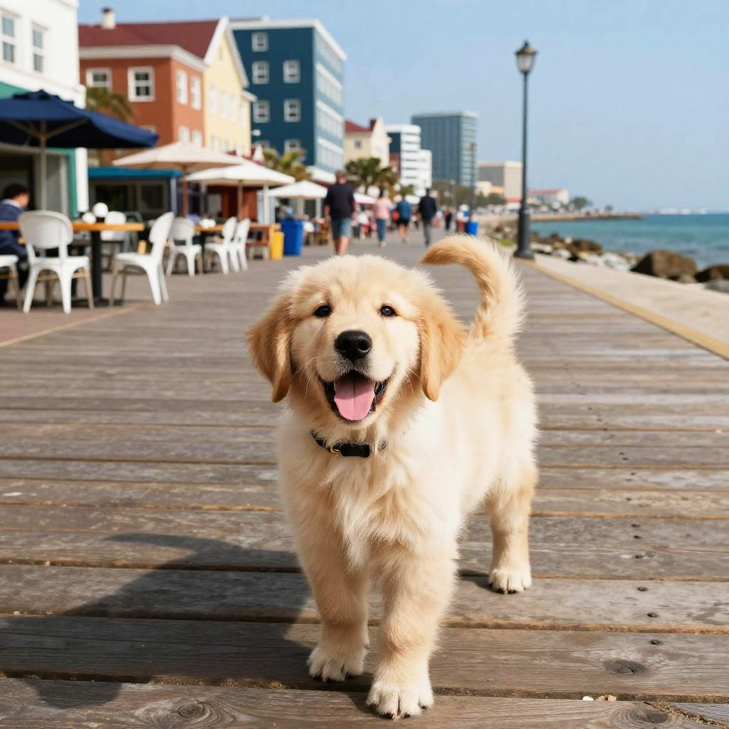 A playful golden retriever puppy by a vibrant seaside boardwalk lined with cafes, capturing the essence of carefree delight on a sunny day, radiating positivity and showcasing the beauty of urban living.