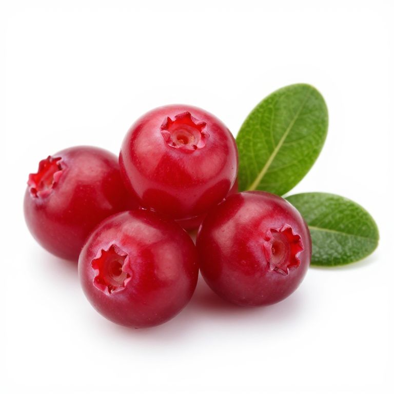 Close-up of four glossy red lingonberries arranged together with two vibrant green leaves on a white background, highlighting their smooth surface and distinctive crown shape.