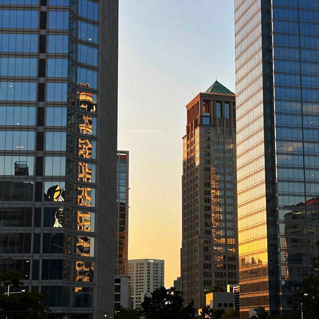 Stable diffusion photography prompts focusing on urban scenes bathed in golden hour light, reflecting off glass buildings with smooth light gradients, subtle shadows, showcasing a harmony between nature and modern architecture with a calming effect.
