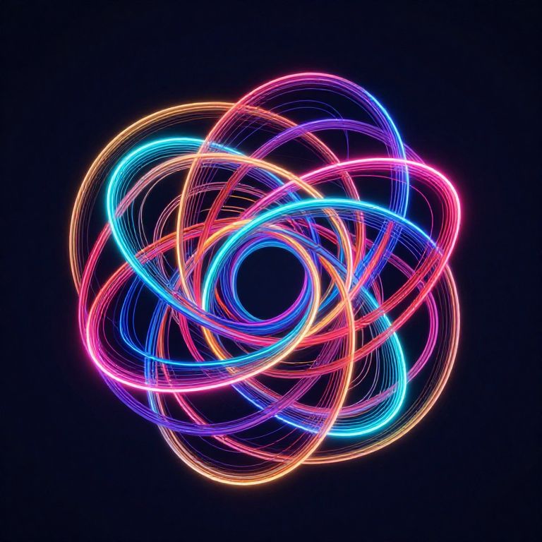 Neon, colorful, interlocking rings light trail against dark blue background, resembling a glowing, abstract, cosmic flower in digital art.