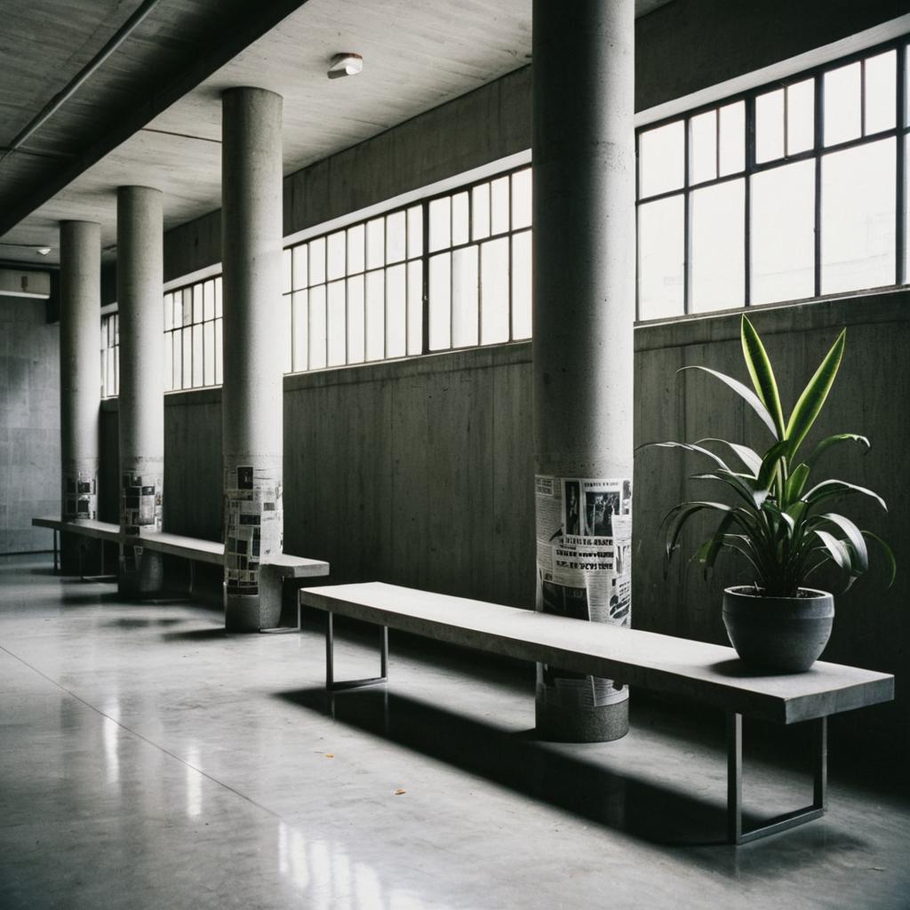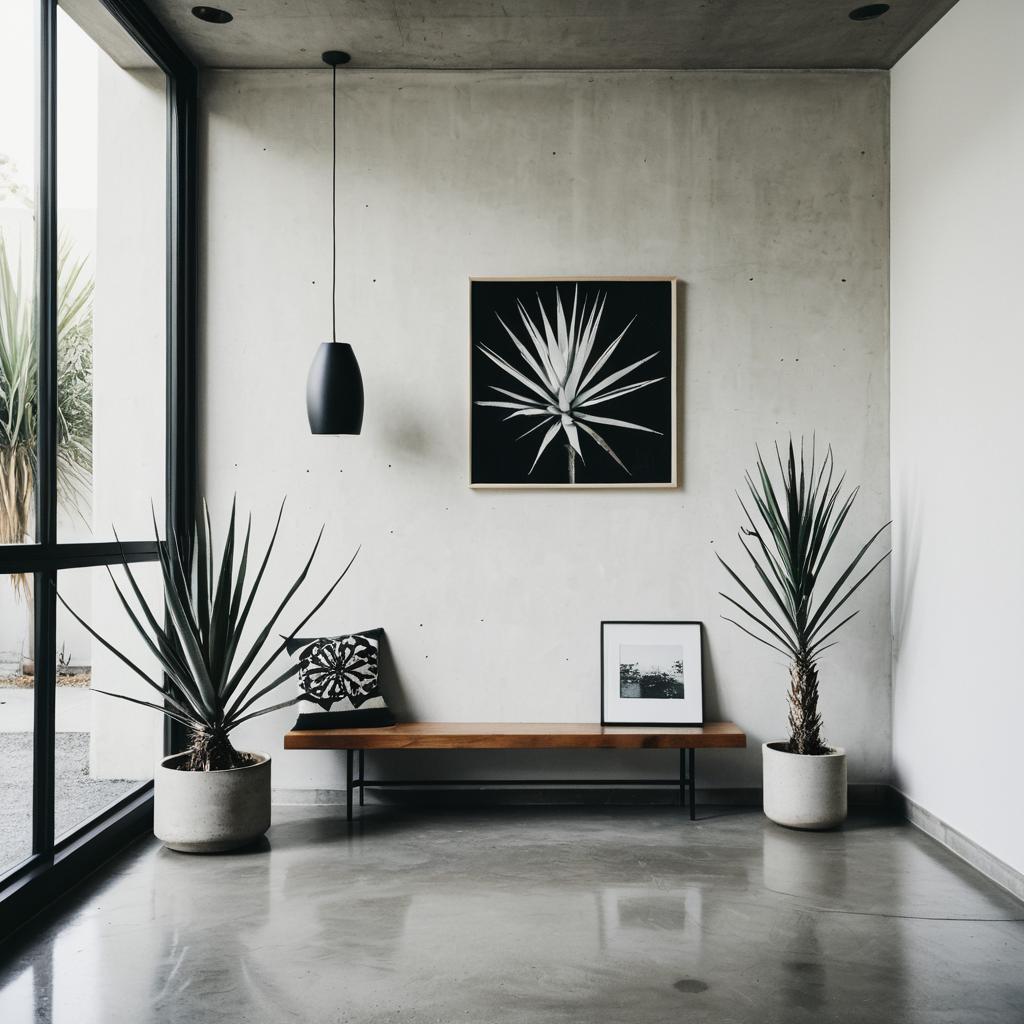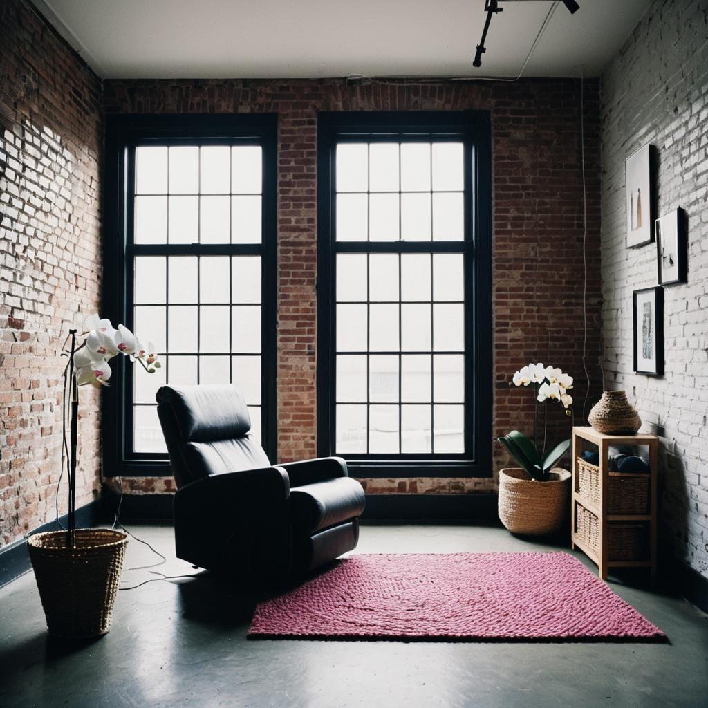 A large minimally decorated room with the dominant focus being a bare exposed brick wall. The room features a tall frosted window, a contemporary recliner in the corner, a basket of yarn on the floor, a flowering orchid, and a minimalist floor lamp.
