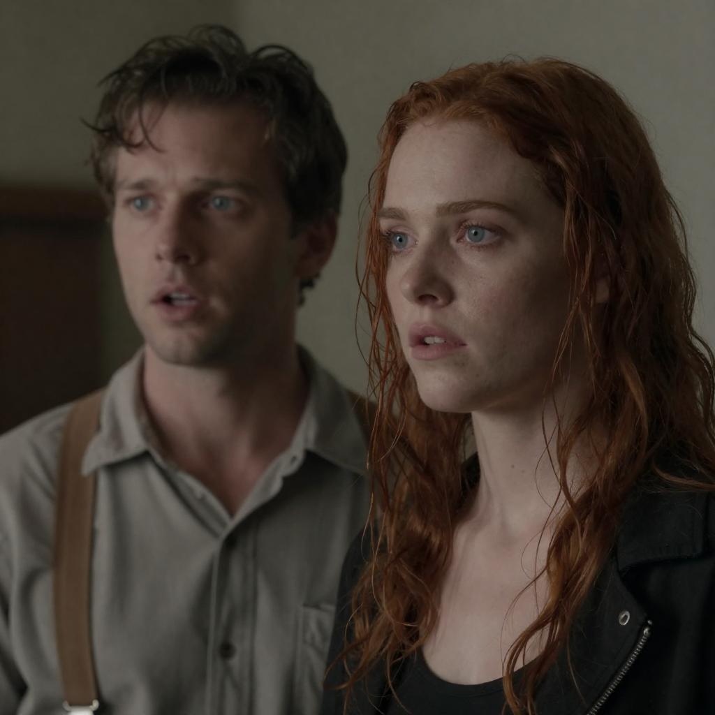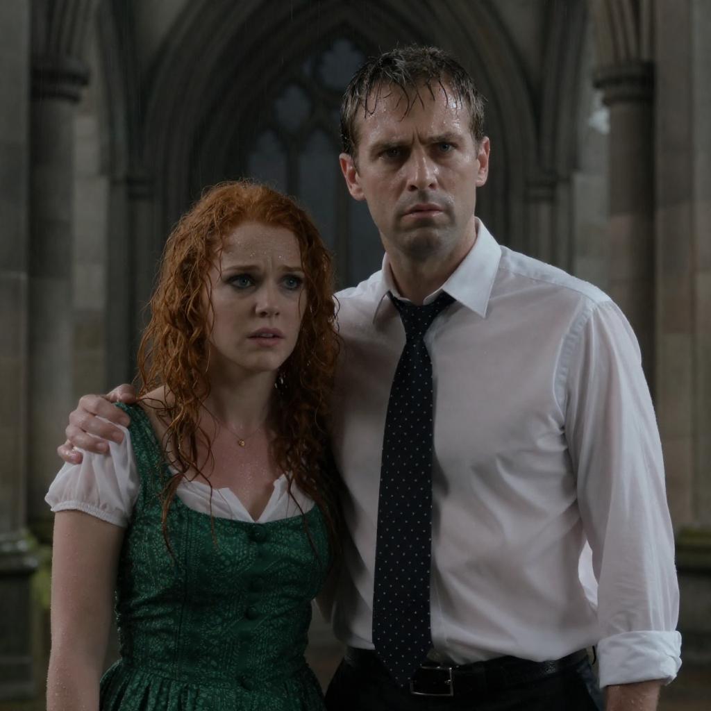Photograph of a man and woman in a Gothic-style archway. Man with short brown hair, white shirt, black polka dot tie, wet, serious expression. Woman with red curly hair, green patterned dress, white blouse, wet, leaning on him, concerned expression. Stone archway background, rain visible. Man's left hand on woman's shoulder.