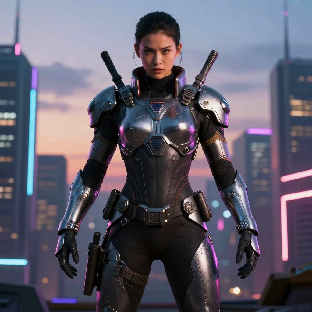 8w7 personality type depicted as a fierce warrior in futuristic armor, bold stance, neon cityscape at dusk, high contrast, cyberpunk aesthetics, intense gaze, vivid details, epic composition