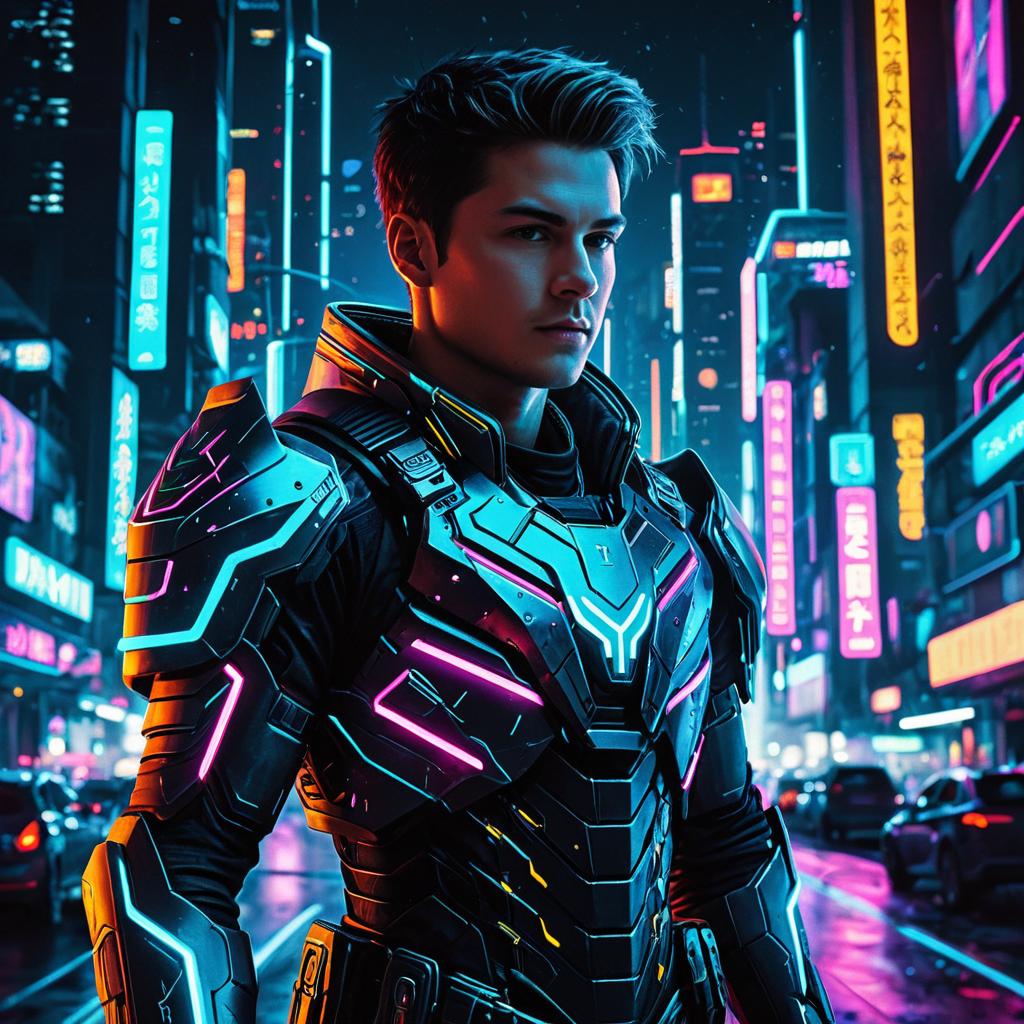 Young Man in Futuristic Neon Armor in Cyberpunk City