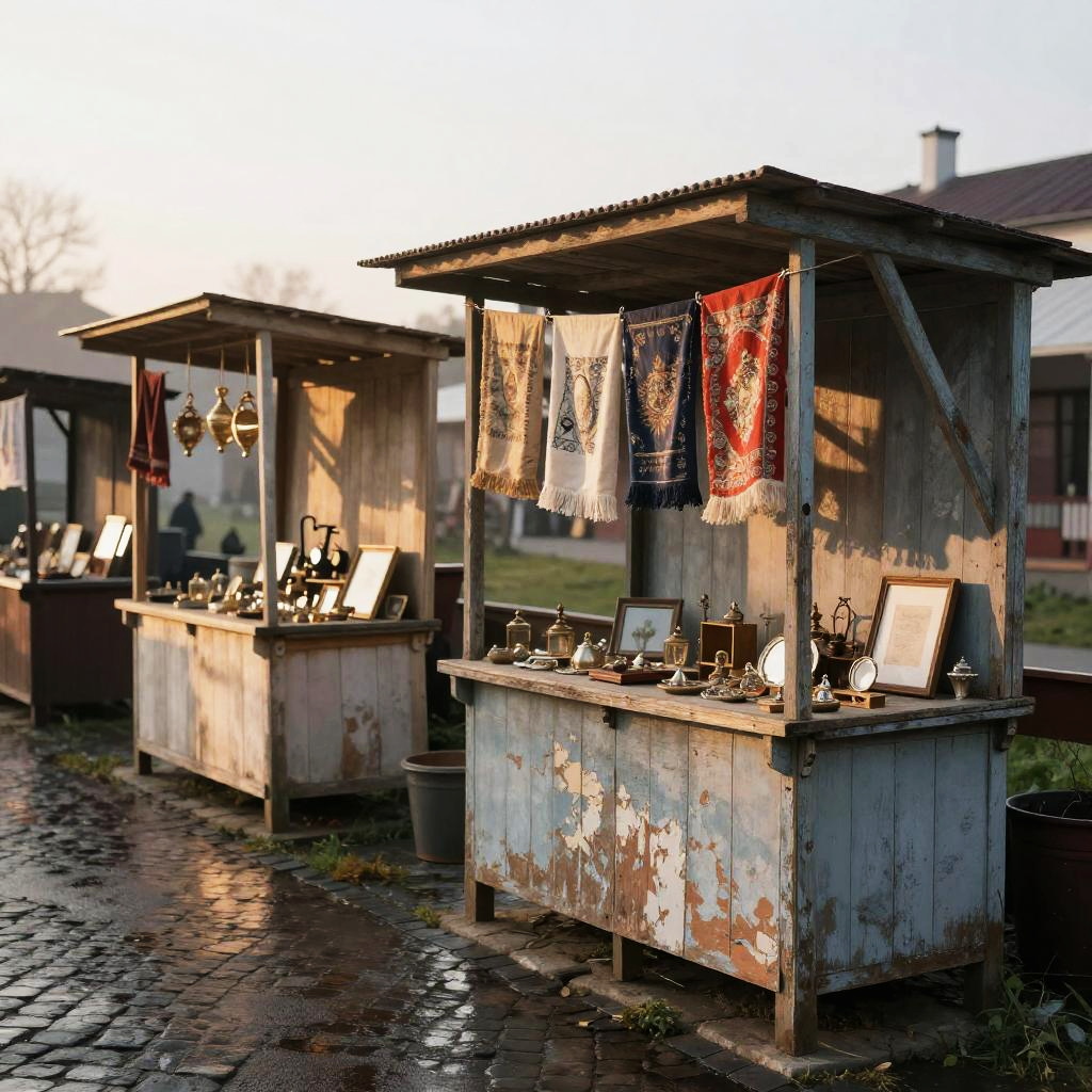 Weathered and worn vintage market scene at dawn, rustic wooden stalls with peeling paint, faded colorful fabrics hanging, antique trinkets scattered, soft morning light casting long shadows, cobblestone streets slightly wet from rain, nostalgic and serene atmosphere