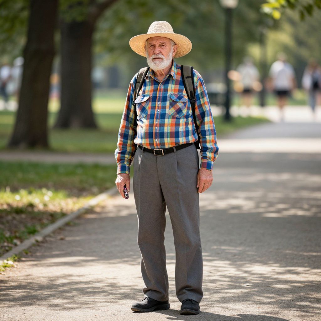 Photograph of an elderly white man standing on a sunlit path in a park. He has a white beard, wears a wide-brimmed straw hat, colorful plaid shirt, gray pants, and black shoes. He's holding a small object in his right hand and has a backpack on his back. The background is blurred with trees and dappled sunlight.