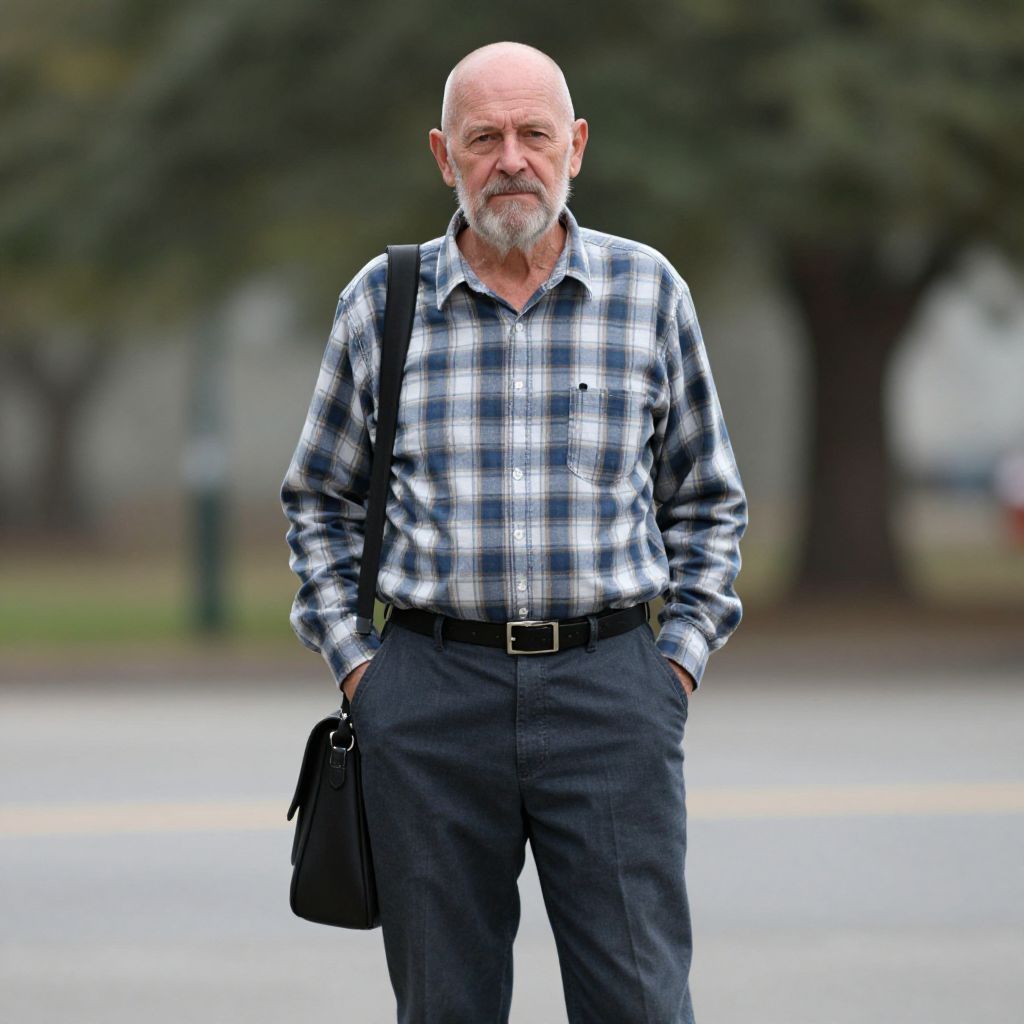 Photograph of an elderly white man with gray beard, wearing a straw hat, plaid shirt, gray pants, and black shoes, standing on a