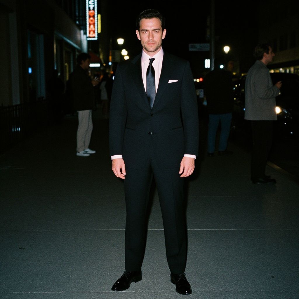 Photograph of a tall, handsome man in a black suit, white shirt, and black tie standing on a dimly lit urban street at night,