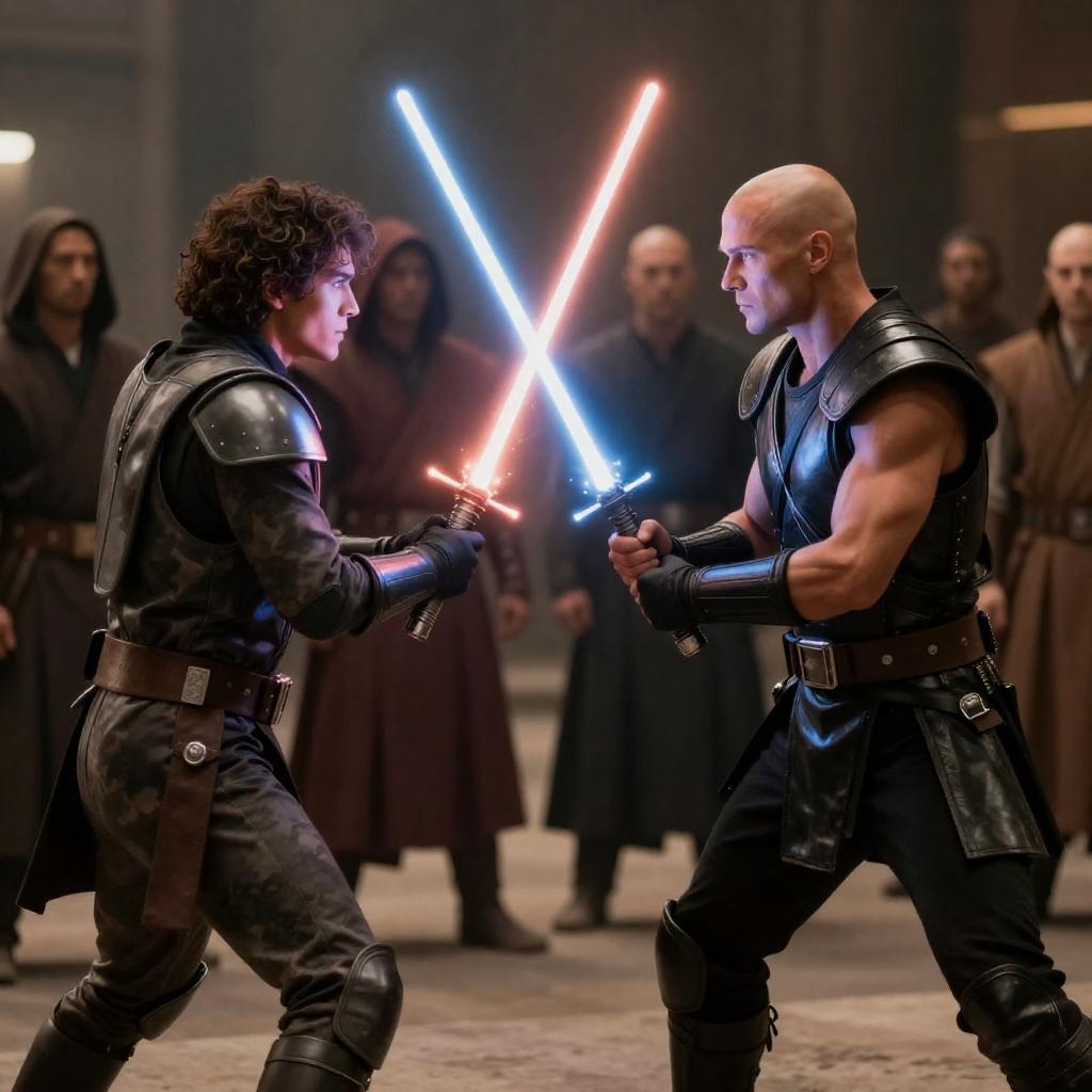 Photograph of a dramatic lightsaber duel between a bald, blonde, muscular man in black leather armor on the right and a curly-haired man in gray, camouflage-patterned armor on the left. A group of robed figures stands in the background, watching intently. Warm, dramatic lighting highlights the intense confrontation.
