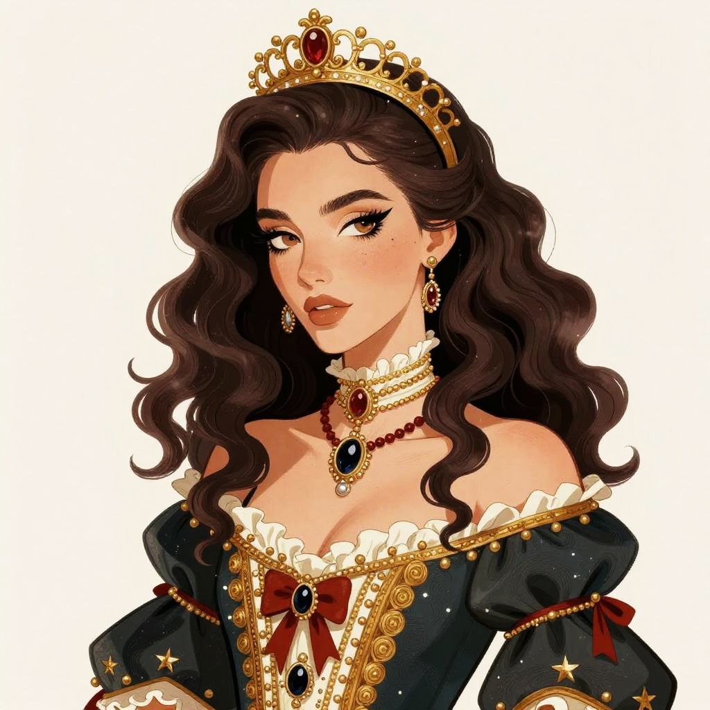 Digital illustration of a woman with dark curly hair wearing a black and gold baroque-inspired dress with puffed sleeves and intricate detailing. She is adorned with a golden crown and matching jewelry featuring blue gemstones. The artwork combines baroque elegance with a modern cartoon erotic vibe.