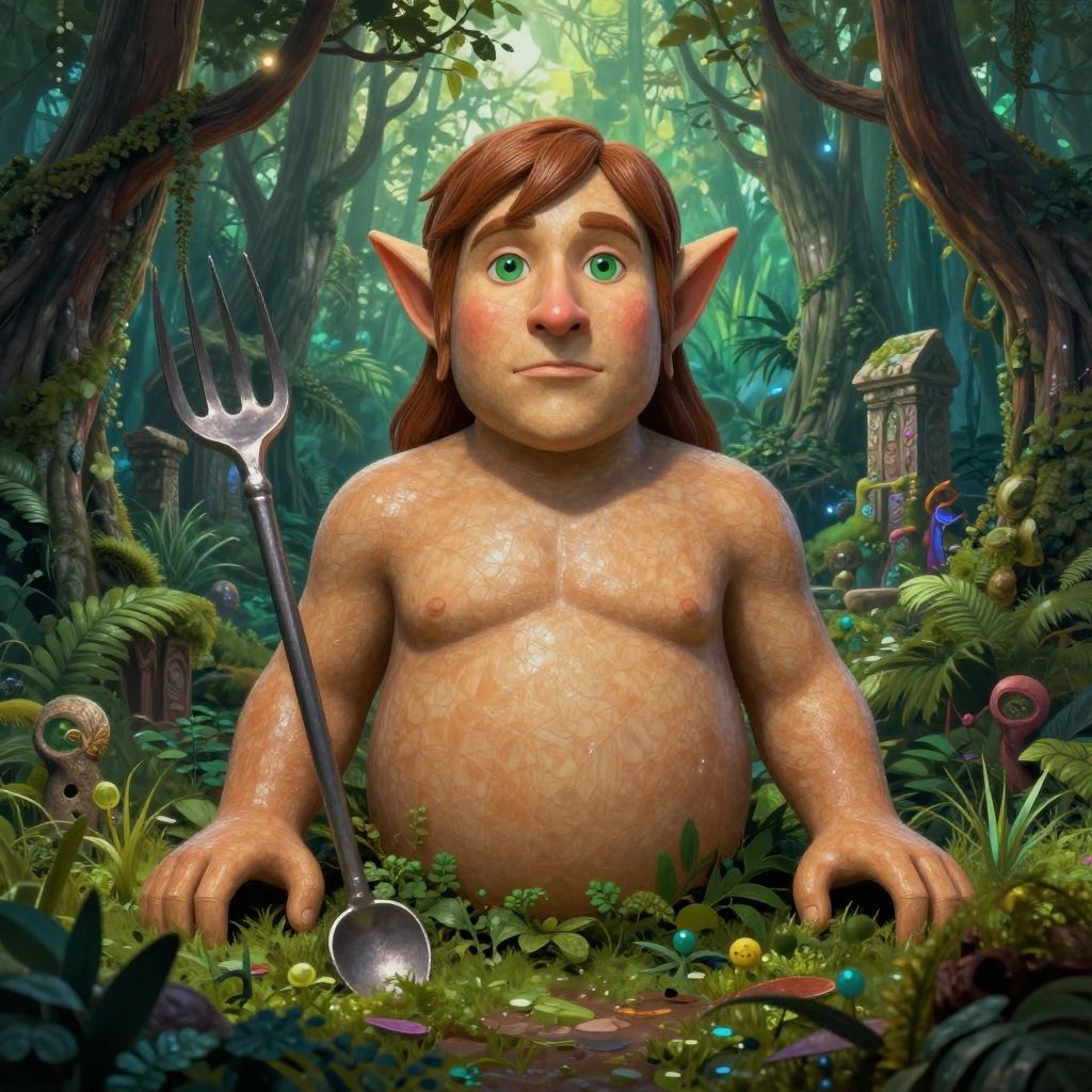 Portrait of a jolly green giant in an elaborate sprout costume, featuring textured leaf patterns and dew drops, set against a surreal landscape of towering plants and colorful flora, digital painting with rich detail and warm lighting.