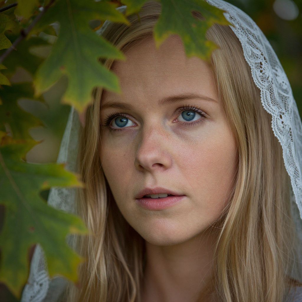Hyperrealistically portray a Nordic woman's enigmatic presence, her piercing blue eyes and silky blonde hair illuminated by soft light filtering through oak leaves. High-definition detail accentuates her features, subtle shadows revealing delicate skin texture. Framed by lace, her expression shifts from contemplation to amusement as she gazes off into the distance, an unusual 'bird's-eye view' perspective adding mystery and accessibility. This portrait seamlessly blends nature's timeless beauty with modern digital artistry, inviting viewers to explore the captivating depths of her enigmatic gaze.