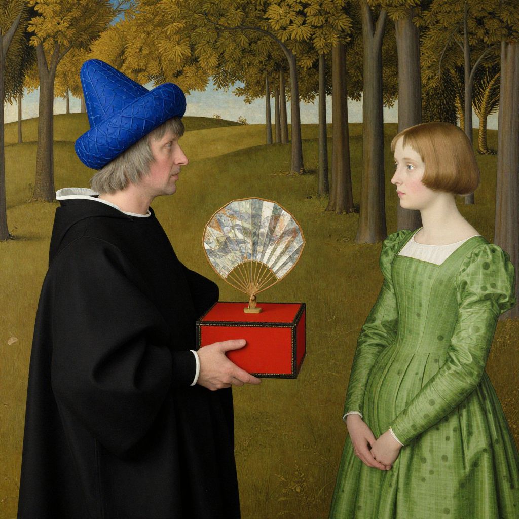 A man in a blue hat and black robe holds a red box with a fan on it, while a woman in a green dress looks on in a scene reminiscent of Hieronymus Bosch's style.