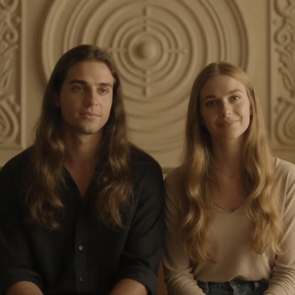 Two people on a red, tufted couch. Woman with long, wavy brown hair, red and black patterned shirt, sits upright. Man with long, blonde hair, dark shirt, reclines on her lap. Acoustic guitar on couch. Dim lighting, relaxed atmosphere.