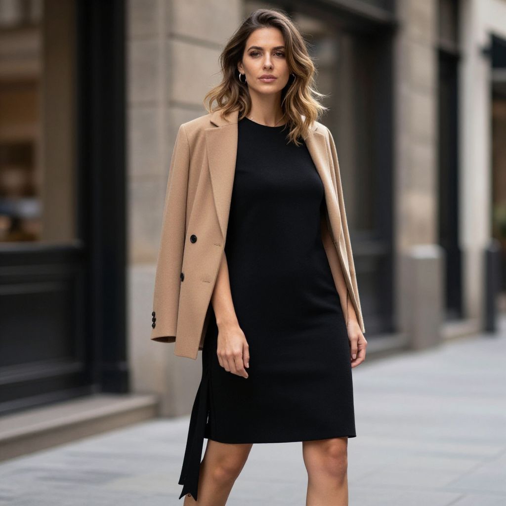 Photograph of a stylish young woman with wavy, shoulder-length brown hair, standing confidently on a city sidewalk. She wears a black, knee-length dress with a subtle asymmetrical hem and a beige, single-breasted blazer with black buttons. Her makeup is natural, accentuating her features. The background features blurred urban architecture with stone buildings and large windows. The lighting is natural, highlighting her outfit and the textures of her clothing. She has a fair skin tone and a slender build. The overall style is modern, chic, and sophisticated.