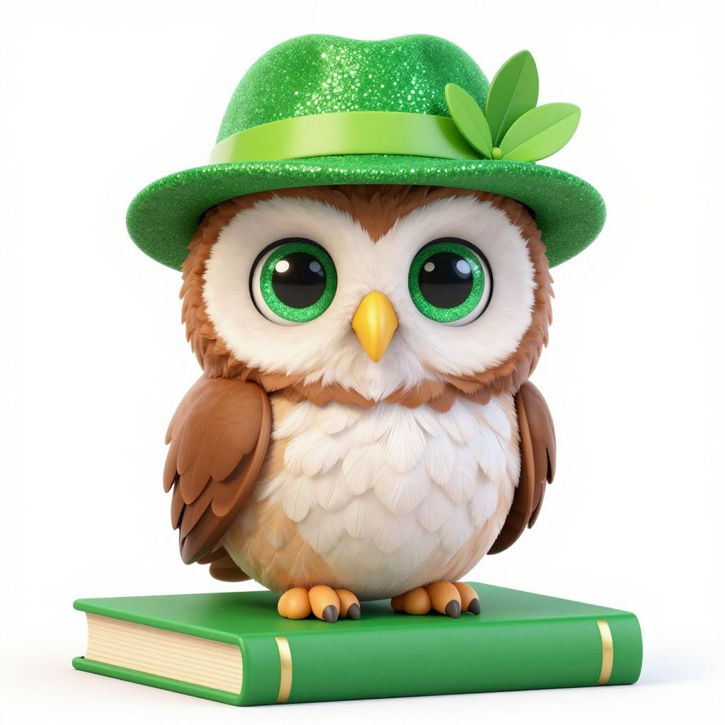 This digital illustration features a cute, cartoon-style owl with large, expressive green eyes and a yellow beak. The owl has brown and white feathered wings and a fluffy white chest. It is wearing a sparkling green hat with a green ribbon and a green leaf accessory. The owl stands on a thick, green book with yellow stripes. The background is plain white, making the colorful owl and book the focal points. The owl's design is whimsical and endearing, with a glossy texture enhancing the sparkling hat and book.