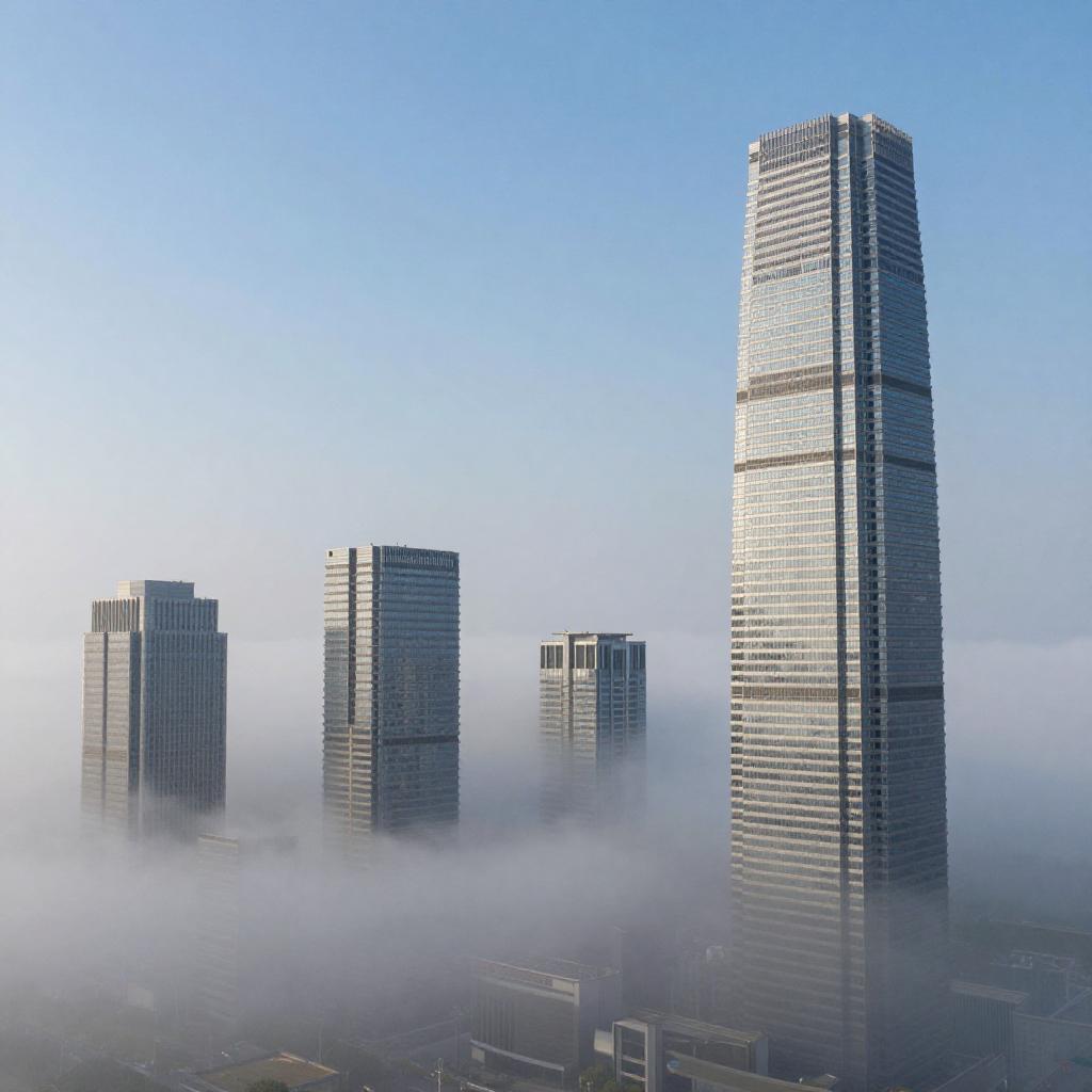 Photograph of modern skyscrapers taken from a low angle, looking up. The buildings have sleek, reflective glass facades with blue-green tint, mirroring a partly cloudy sky. Lighting is natural, bright, and even. The foreground buildings are in sharp focus, while the background skyscraper is slightly blurred, creating a shallow depth of field. The image has a dynamic, upward perspective.