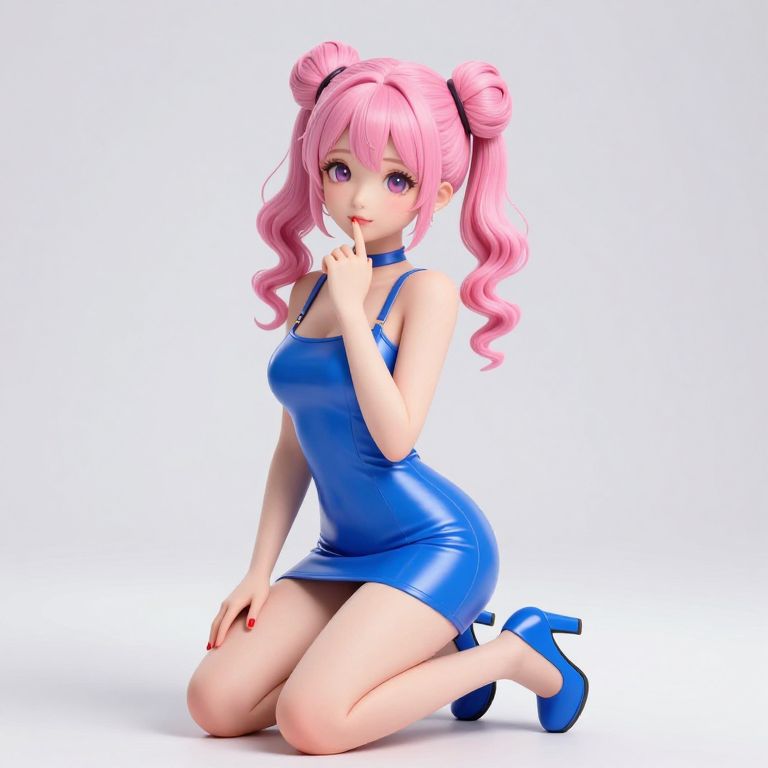 This is a CGI image of a cute, anime-style girl with pink, wavy hair in two buns. She's kneeling on the floor, wearing a shiny, tight, blue mini-dress and matching blue heels. Her right hand is touching her lips, and she has red nail polish. The background is a plain, white, industrial-looking wall. The image has a glossy, 3D-rendered look.