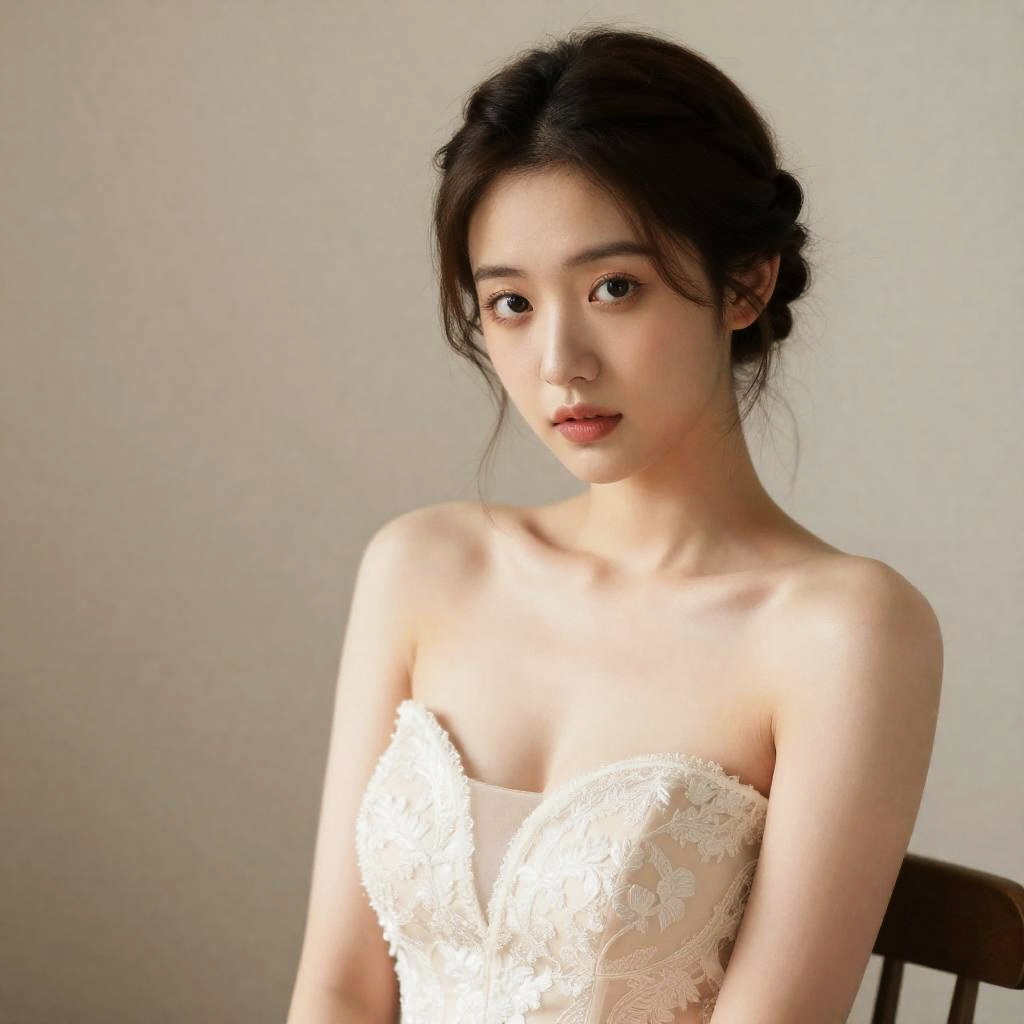 Photograph of an Asian woman with fair skin, black hair in a loose bun, wearing a strapless white lace wedding dress, looking directly at the