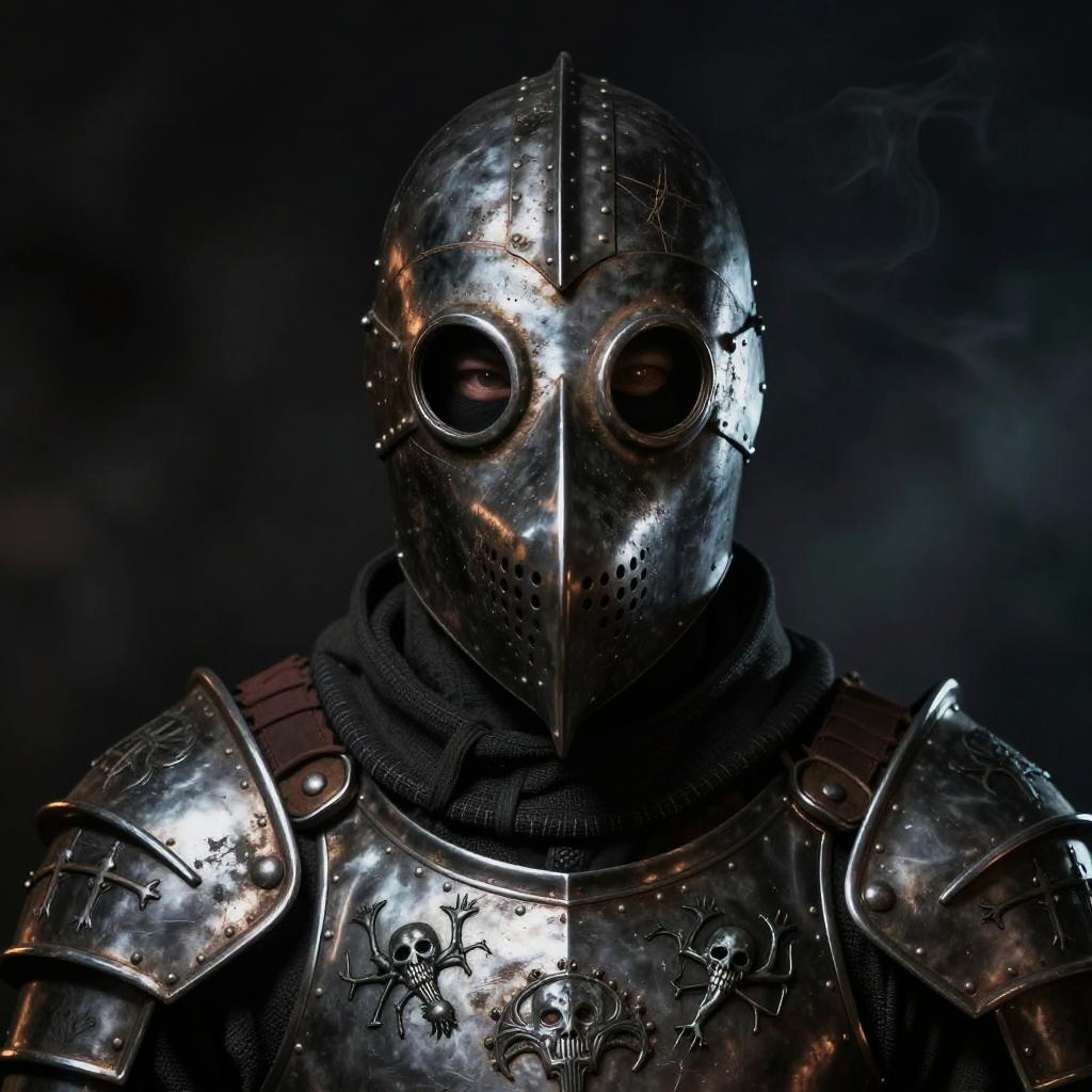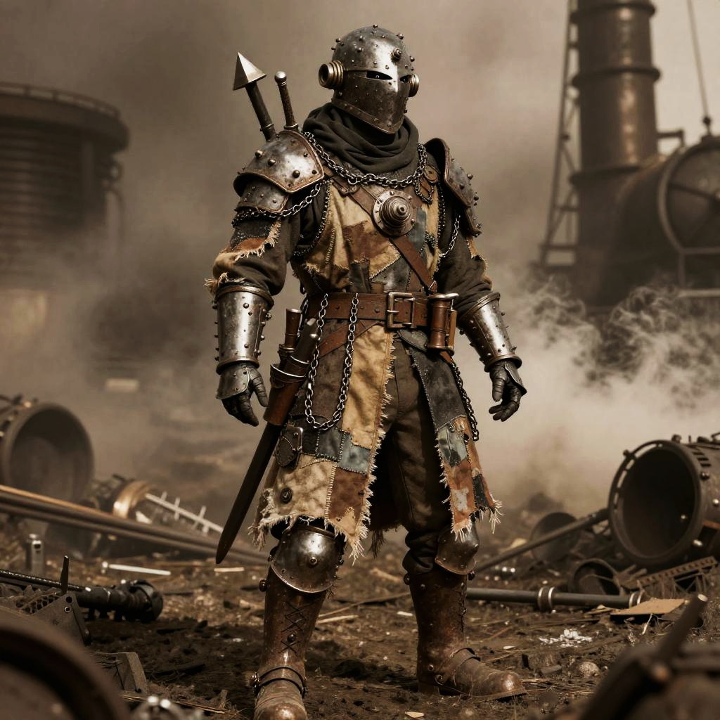 Makeshift armor composed of patchworked cloth, rusted chainmail, and broken weapons strapped together, worn by a steampunk soldier in a smoky industrial battlefield, sepia tones, dramatic shadows, intricate mechanical details.