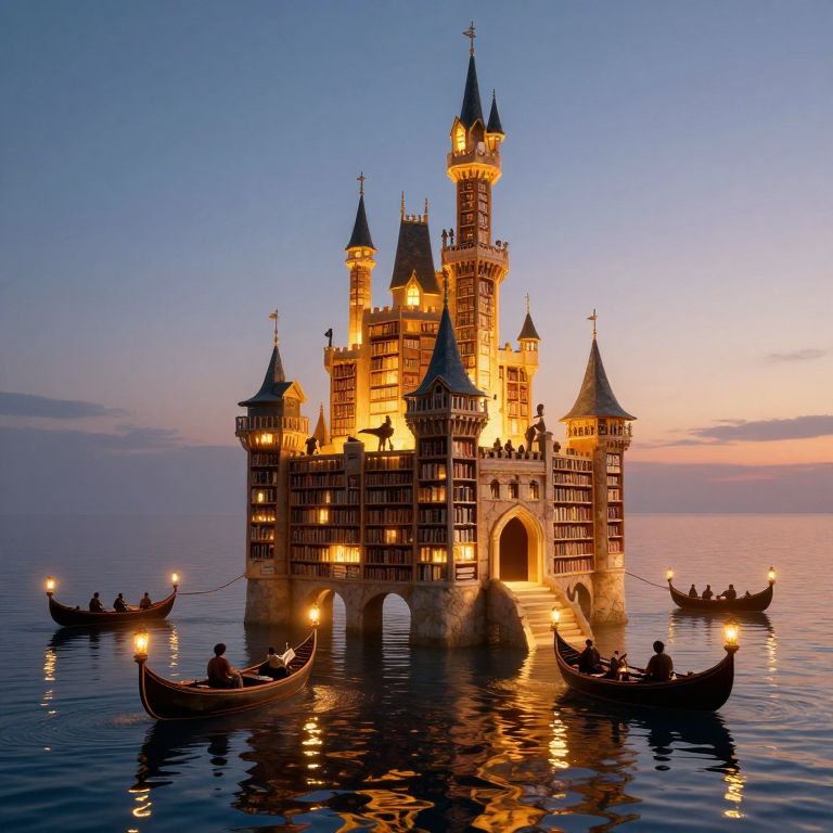 A fantastical 3D-rendered scene depicts a luminous castle constructed from towering bookshelves, suspended above a tranquil sea of liquid ink, illuminated by warm golden-hour lighting as readers navigate the waters in gondolas crafted from vellum, guided by the soft glow of candle-lit lanterns that cast ethereal reflections on the mirrored surface below.