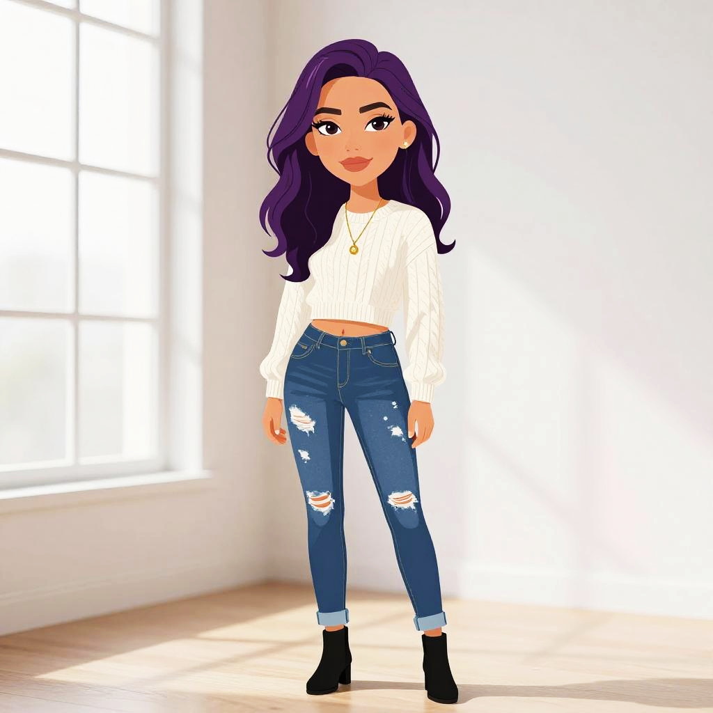 Woman with pretty face and pretty hair. Woman, casual, cropped ribbed mock turtleneck top with short sleeves in light gray, distressed denim jeans with ripped knees and frayed edges, low-rise, slim fit, patent leather high heels with red soles. --sref 1467