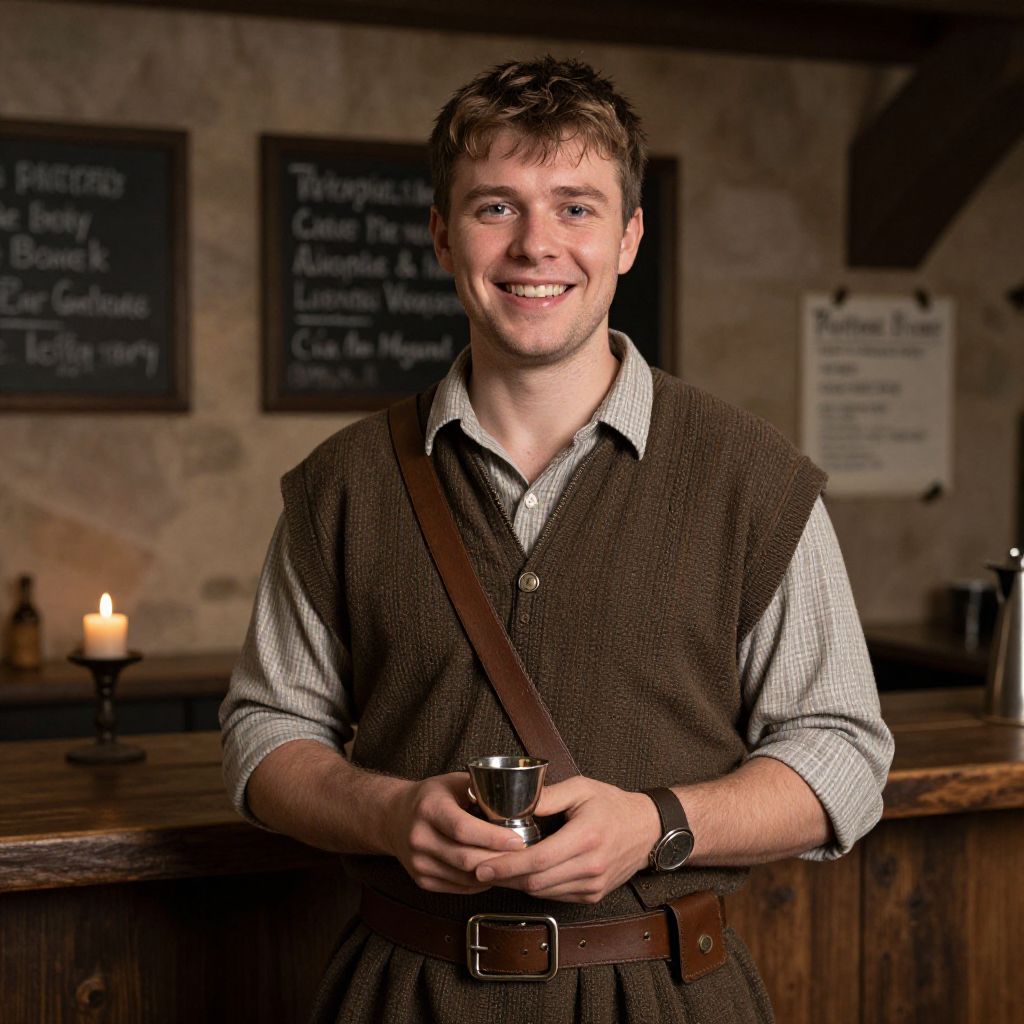 Portrait of a young Caucasian male dressed in medieval-style clothing standing behind a wooden bar in a rustic tavern. He wears a brown knitted vest over a beige checkered shirt, with a wide leather belt and a leather strap across his chest. The man is smiling warmly while holding a small metal cup. The background includes vintage wooden decor, lit candle, and chalkboard menus, evoking an authentic old medieval tavern atmosphere.