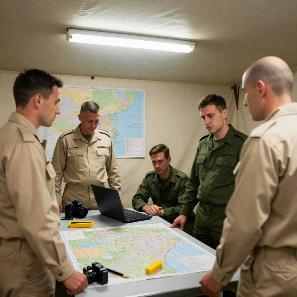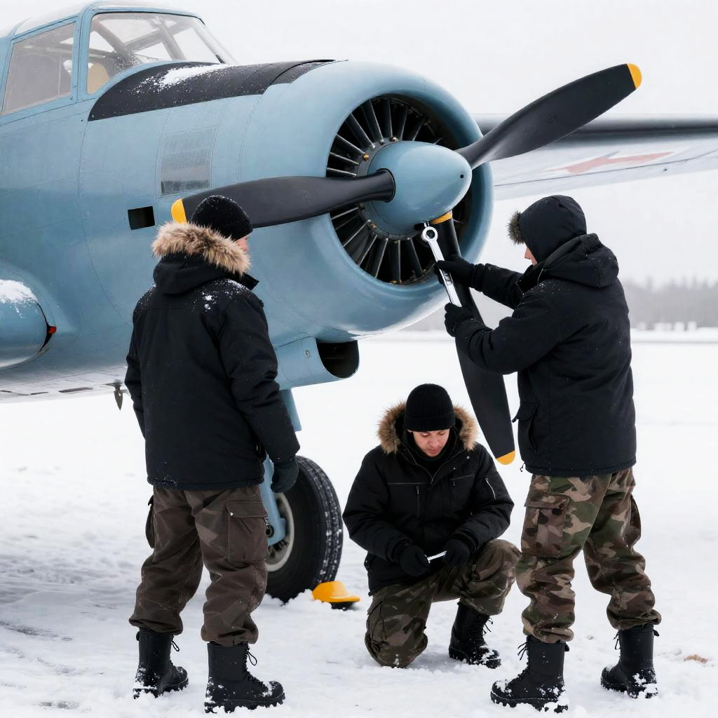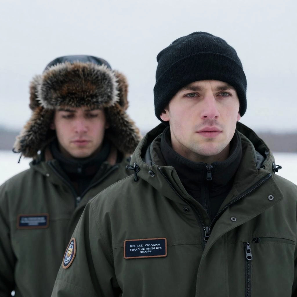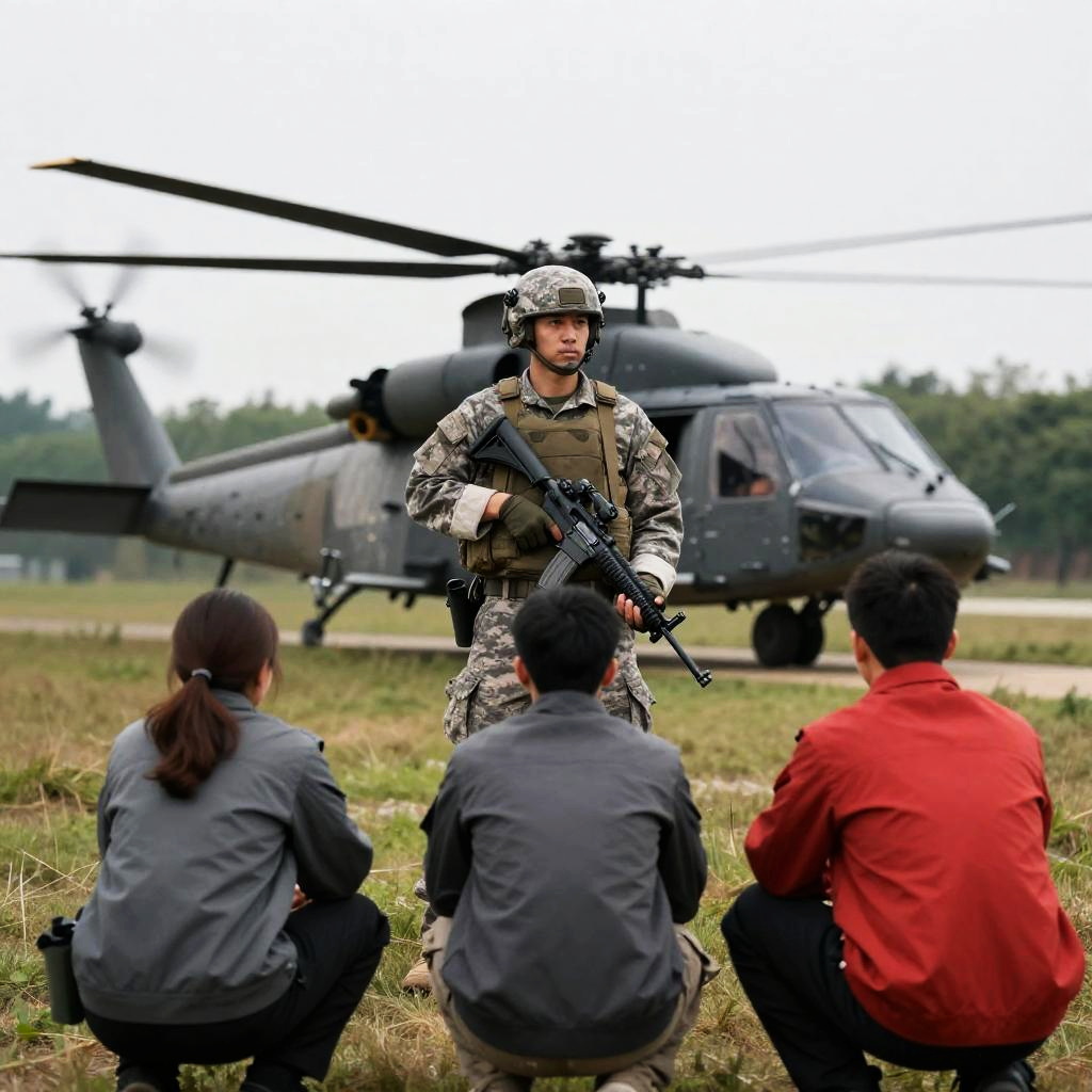 Photograph of five people near a snow-covered military helicopter. Four wear camouflage and black hoodies, one in a brown jacket. Snowy ground, scattered rocks, and helicopter nose and side visible. People crouch, kneel, and stand, interacting with the helicopter. Snow on clothing, overcast sky in background. Intense expressions on some faces.