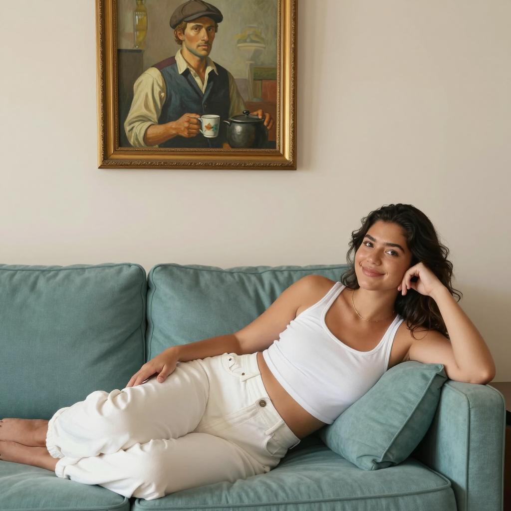 Young woman with light brown skin, wearing a green satin dress with floral patterns, standing in an art gallery. Her hair is in a loose bun with bangs. She looks to the right with a neutral expression. She wears a necklace and bracelet. Two framed paintings are on the wall behind her, one with a golden forest and another with a blue teapot on a snowy landscape. The painting on the right has a yellow vertical pattern. She stands with her hands by her sides.