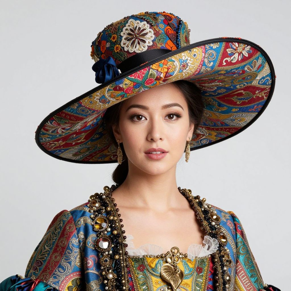 A woman in a vibrant, opulent outfit with a large, ornate hat, featuring intricate patterns and bold colors, reminiscent of Rococo fashion.