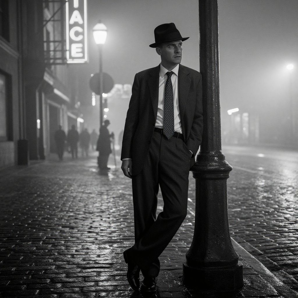 Noir detective costume scene showing a detective leaning against a lamppost under a flickering streetlight, fog rolling in, wet cobblestones reflecting neon signs, sharp suit and tie with a classic fedora, capturing the gritty 1940s cityscape in monochrome tones