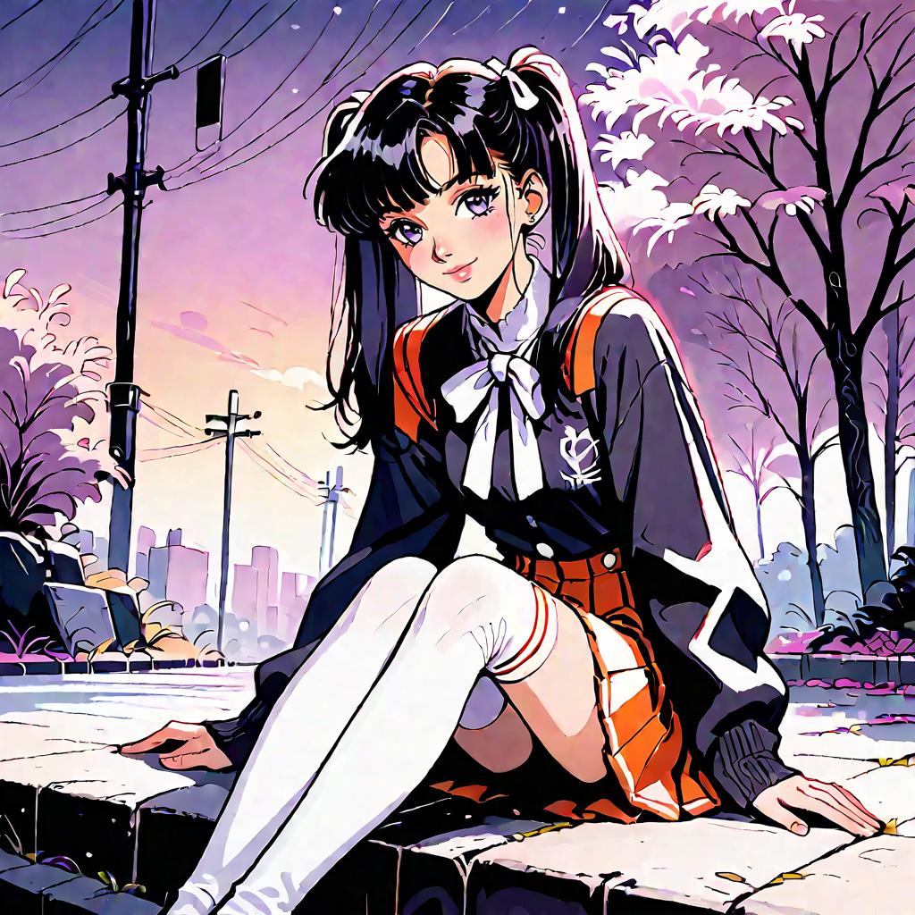 Score_9, score_8_up, score_7_up, score_6_up, score_5_up, score_4_up, rating_safe, source_anime, 1girl, solo, long_hair, looking_at_viewer, smile, bangs, skirt, shirt, black_hair, black_thighhighs, long_sleeves, ribbon, twintails, sitting, closed_mouth, purple_eyes, jacket, hair_ribbon, pleated_skirt, outdoors, miniskirt, blunt_bangs, zettai_ryouiki, black_shirt, night, white_ribbon, hair_over_shoulder, retro_artstyle, orange_skirt