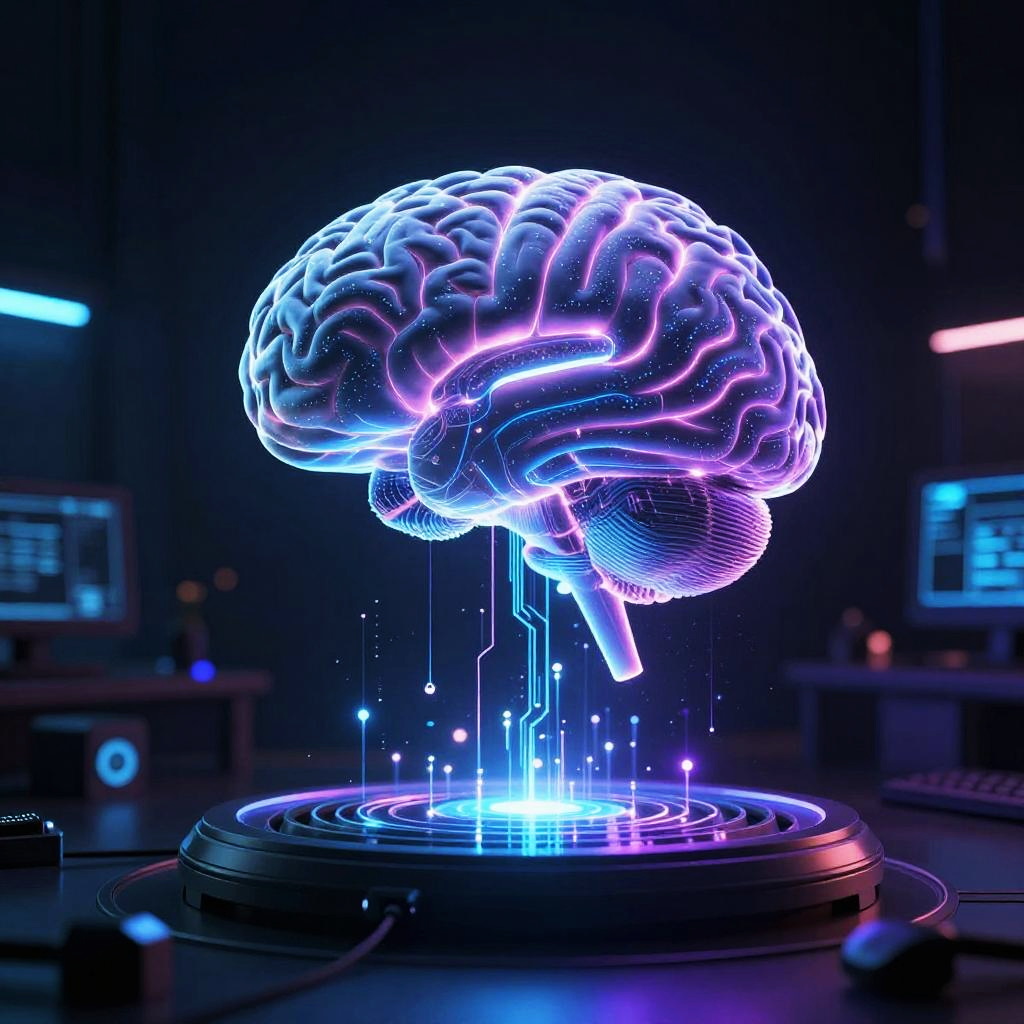 Neon-lit, glowing brain hologram floating above a futuristic, blue-lit, circular platform in a dark, high-tech laboratory. Digital art