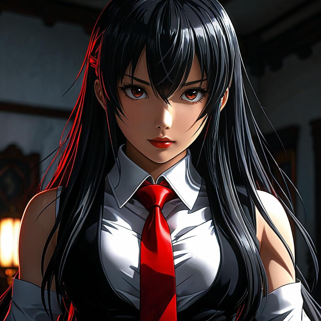 This digital anime-style illustration features a young woman with long, straight black hair and red eyes. She wears a white button-up shirt with a red tie, and a black vest. Her shirt is slightly unbuttoned, revealing a hint of cleavage. She has fair skin and a serious expression. The background is dark with blurred, indistinct shapes, suggesting an indoor setting. A soft, warm light source is visible in the lower left, casting red highlights in her hair. The artwork uses high contrast and detailed shading to emphasize her features and clothing.