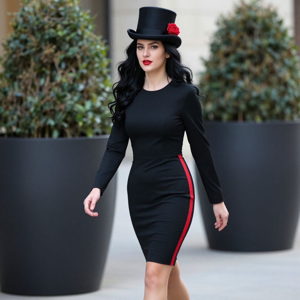Photograph of a fair-skinned woman with long, wavy black hair, wearing a tight, black long-sleeve, knee-length dress with a red stripe down the side. She has bold red lipstick and is adorned with a black top hat featuring a red rose on the left side. She is walking outdoors, with two large, black planters filled with greenery in the blurred background. The image has a vibrant, slightly stylized look, with sharp focus on the woman and a soft-focus background. The overall aesthetic is modern and chic.