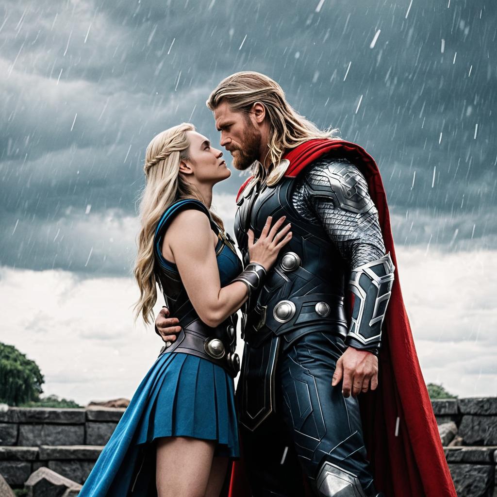This digitally created, hyper-realistic image depicts a romantic scene between Superman and Wonder Woman in the rain. They stand close, about to kiss, with Wonder Woman's hands on Superman's chest. Wonder Woman, with long blonde hair and a blue pleated skirt, wears a black, metallic armor top with silver accents. Superman, with his iconic red cape and black, silver-patterned suit, gazes intently at her. The background shows a stone wall and a cloudy, rain-filled sky, adding a dramatic atmosphere. The image emphasizes their muscular physiques and the contrast between their costumes.