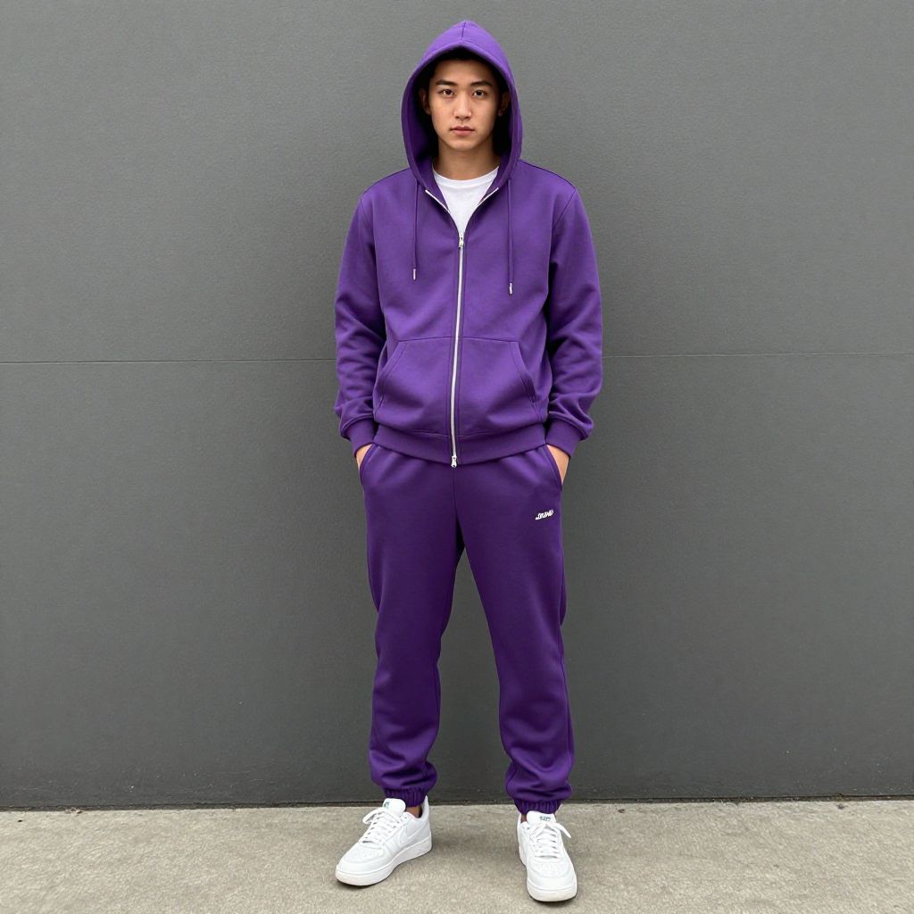 Photograph of an Asian teenage boy in a blue hoodie and matching joggers, white sneakers, standing with hands in pockets, hood up, outdoors with