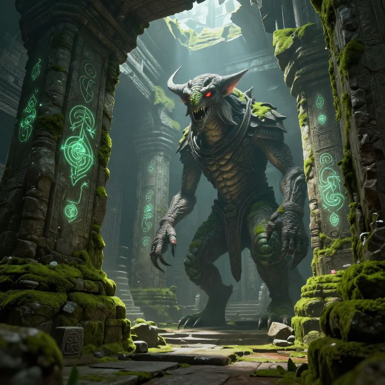 CGI fantasy image of a muscular, horned, scaly, dark green dragon-like creature standing in a moss-covered, ancient, ruined temple with