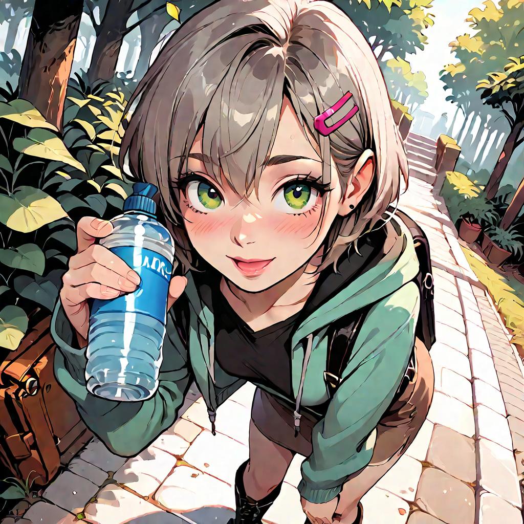 Score_9, score_8_up, score_7_up, best quality, masterpiece, source_anime yukimura aoi, 1girl, solo, bag, backpack, downblouse, short hair, looking at viewer, blush, open mouth, green eyes, grey hair, smile, outdoors, stairs, collarbone, green jacket, bottle, black shirt, long sleeves, eyebrows visible through hair, tree, brown skirt, hair ornament, hairclip, from above, water bottle, holding bottle, hair between eyes, day, miniskirt, open jacket, brown hair, standing, leaf, small breasts, knee boots, pencil skirt, dutch angle, :d, hoodie, bush, ground vehicle, hood down, hooded jacket, black footwear, drawstring, extended downblouse, leaning forward