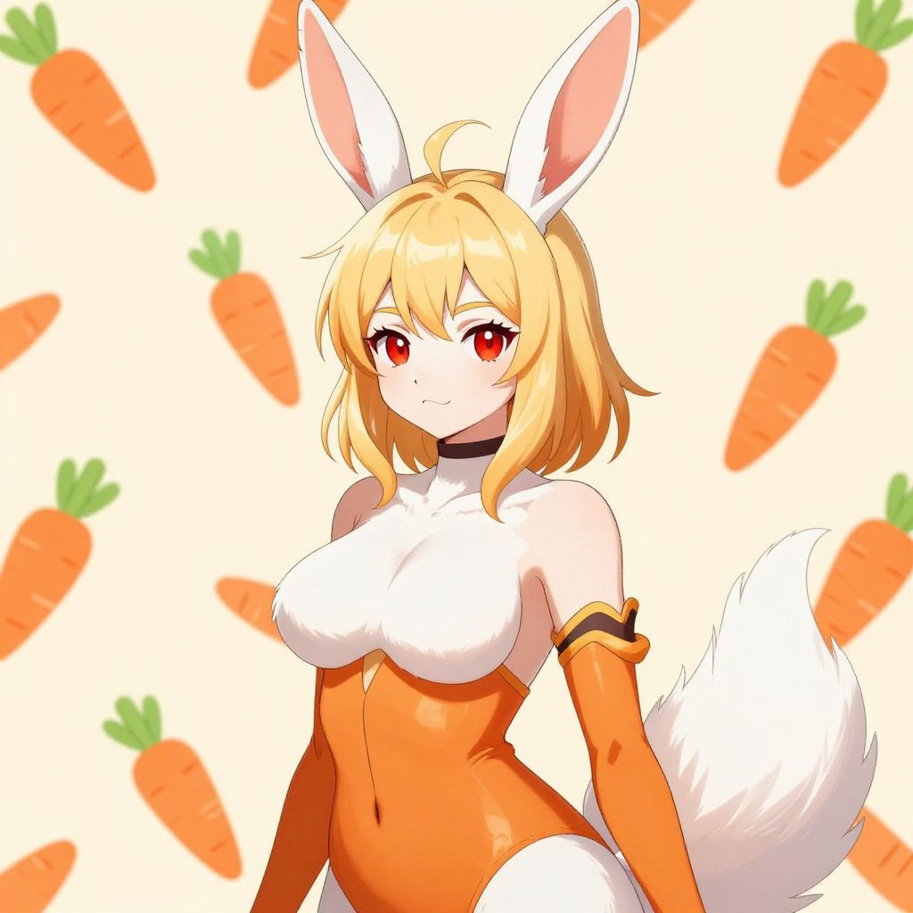 This digital anime-style drawing features a cute, blonde, rabbit-eared girl with red eyes. She wears an orange, form-fitting, leotard-like outfit with white fur accents on her chest and a fluffy white tail. Her orange gloves match the outfit. The background is white with a pattern of orange carrots with green tops. She has a slight, confident smile and her hair is shoulder-length, with bangs framing her face. The overall style is vibrant and playful, typical of anime art. The character's large, white rabbit ears stand upright, adding to her adorable appearance.