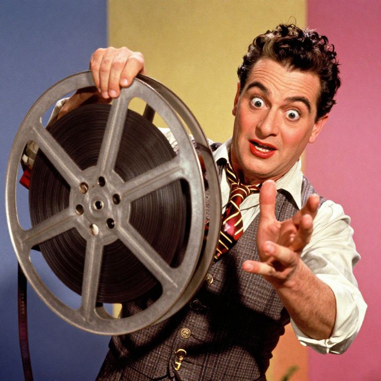 Photograph of a man with curly black hair, dressed in a white shirt, red tie, and grey plaid vest, holding a large metal film reel in his right hand and pointing with his left hand. His wide-eyed expression suggests surprise or excitement. The background features a colorful gradient from blue to yellow to pink. The image has a vibrant, slightly exaggerated, and comedic style, with a high-contrast, almost cartoonish appearance, highlighting the subject's expressive features and the textured film reel.