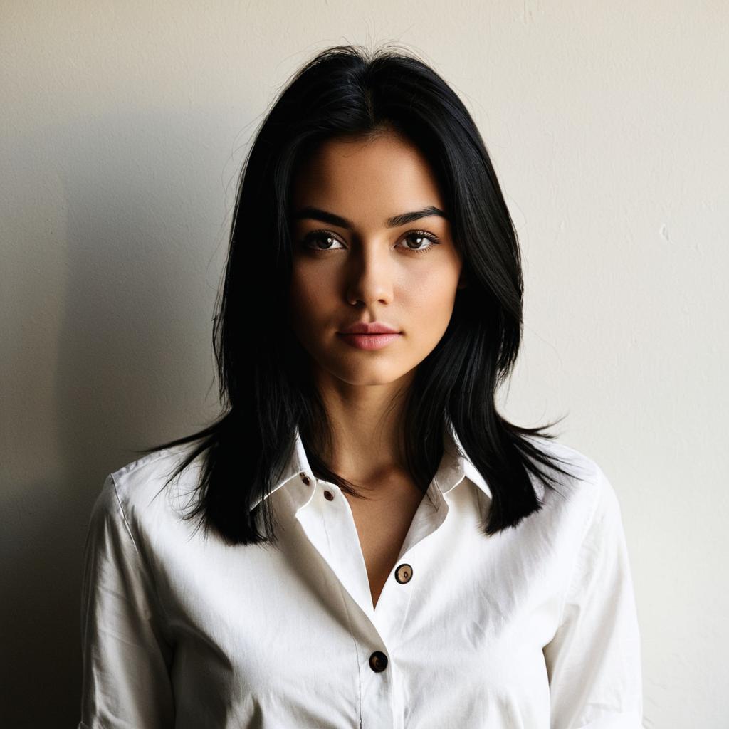 A realistic portrait of a young woman with short blonde hair and striking eyes, wearing a fitted white button-up shirt and slim black pants, golden hour lighting accentuating smooth skin texture, warm brown and beige colors, detailed facial features, urban street art background