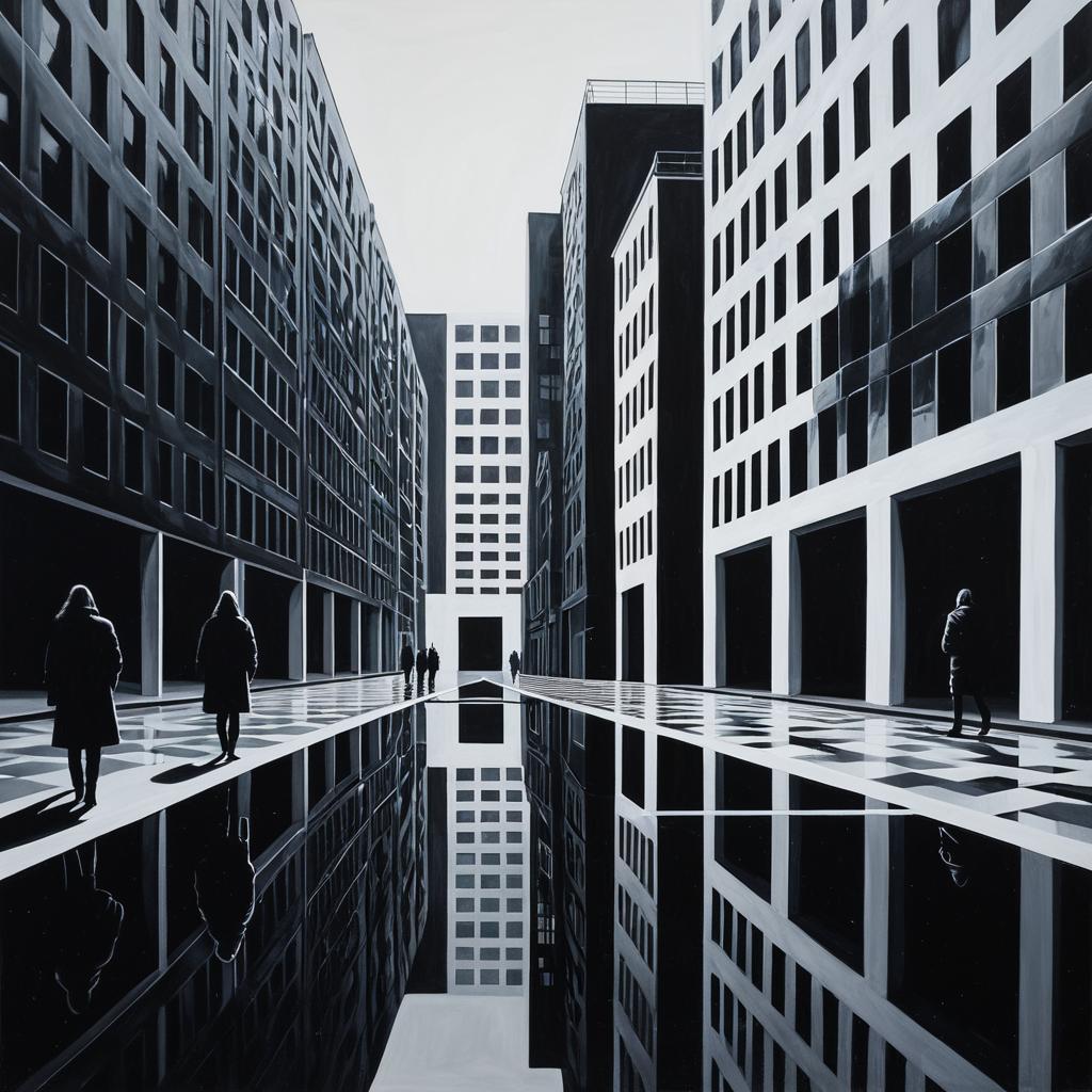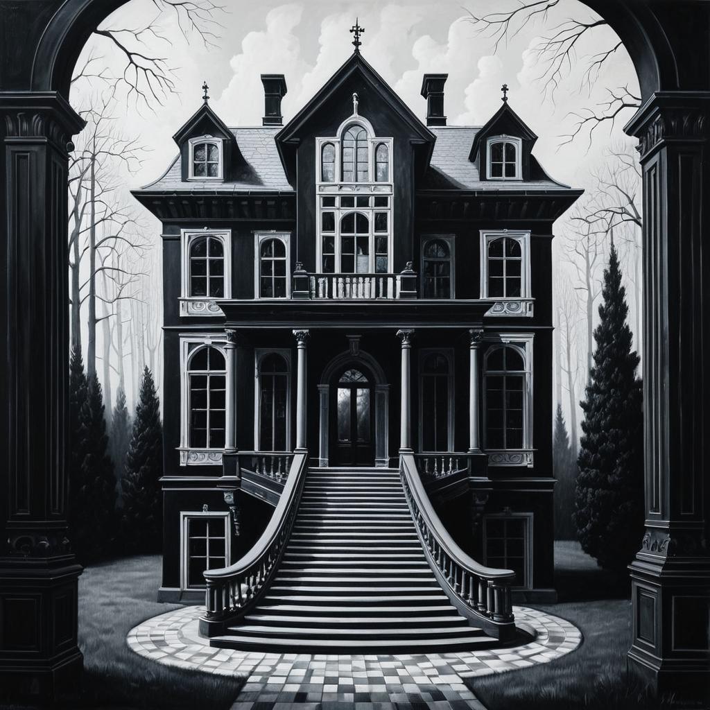 A surrealistic monochromatic painting of a surreal manor featuring elongated staircases and floating windows. Scandinavian contemporary art style, hyper-realistic oil painting, luxurious and haunting