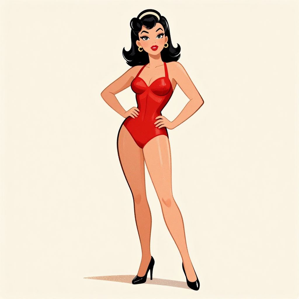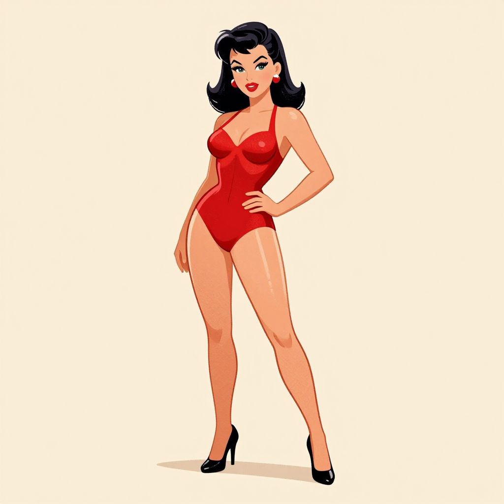 A vibrant vintage pinup illustration featuring a woman in a red bodysuit and black heels, rendered in a classic cartoon style with bold lines and soft shading, set against a minimalist beige background with a touch of retro charm.