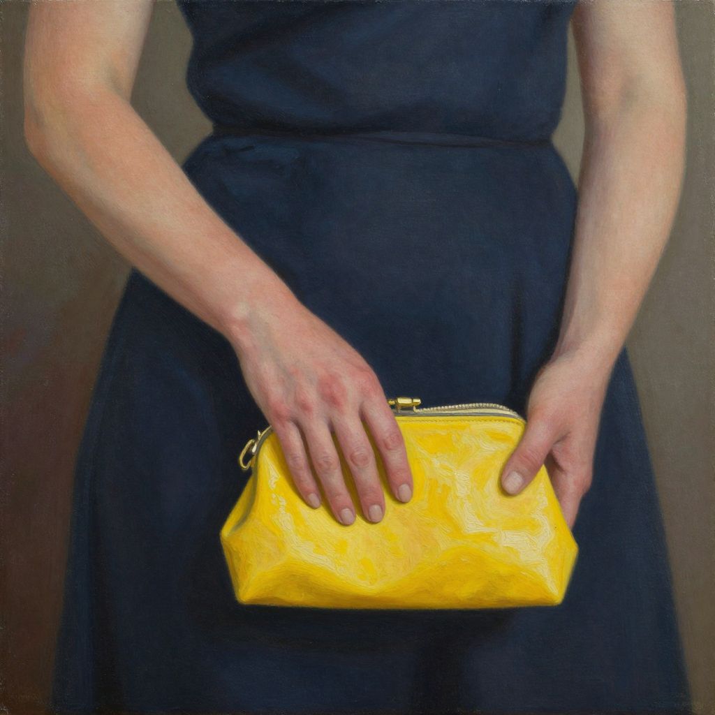 Photograph of a person's lower torso and hand. The individual wears a sleeveless, black, knee-length dress with a cinched waist. Their right hand, with light skin and slender fingers, grips a bright yellow, glossy, rectangular clutch purse with a silver zipper. The background is a plain, light gray wall. The contrasting colors of the black dress and yellow purse draw attention to the hand and accessory. The image has a soft focus, giving a slightly blurred effect to the background and dress, emphasizing the vivid yellow clutch.