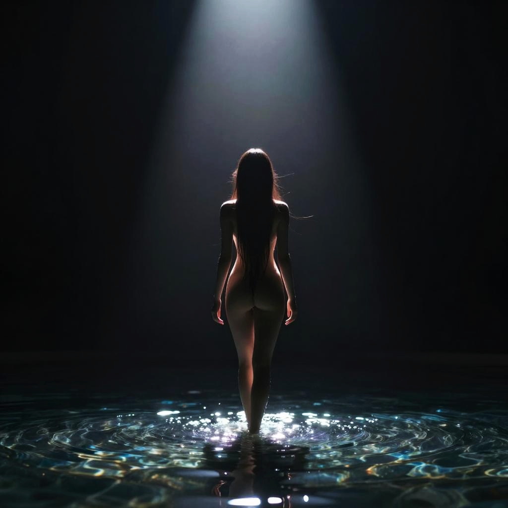 This digital artwork features a tall, slender figure with long hair standing in a pool of water. The figure is backlit, creating a striking trail of light that stretches upwards into the dark, almost black background. The light reflects off the water, giving a shimmering effect. The figure's silhouette is soft, and the overall composition is minimalistic and dramatic.