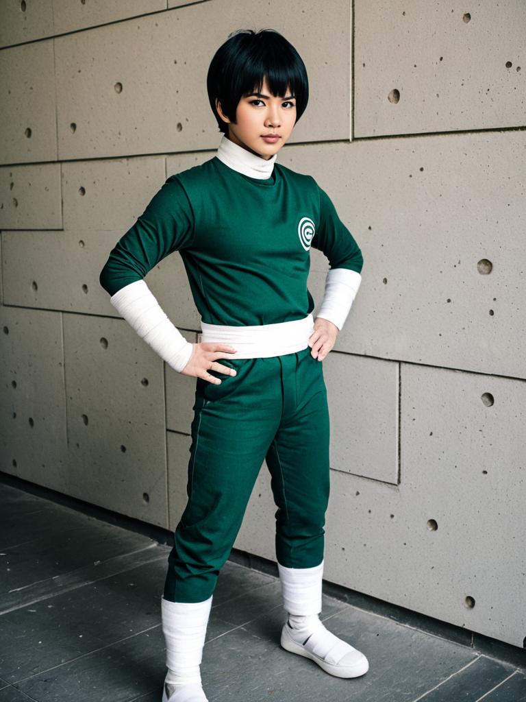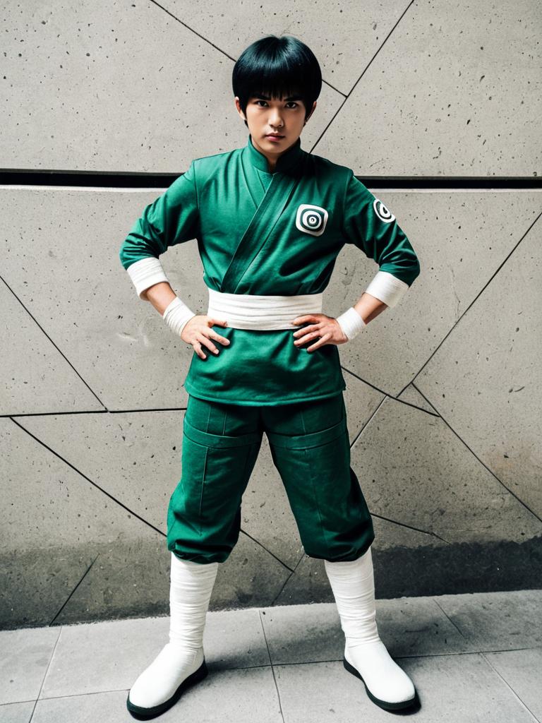 Photo-realistic cosplay photo of person in rock lee costume. Full body. Standing. Full length. 1boy, black eyes, thick eyebrows, black hair, short hair, bowl cut, bandaged hand, bandaged arm
