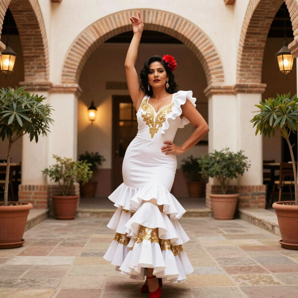 A vibrant photograph of a curvy, dark-haired woman with olive skin, wearing a white, ruffled, gold-embellished flamenco dress and red heels. She poses confidently with one arm raised and the other on her hip, set against a rustic, Mediterranean-style courtyard with brick arches, potted plants, and warm lantern lights. Her red flower hair accessory adds a pop of color.