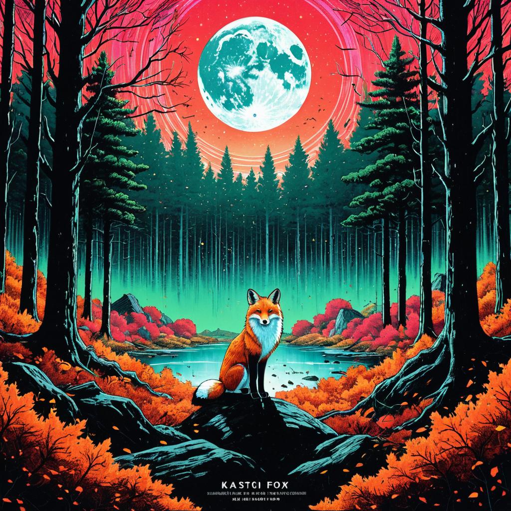 New-school album cover art showcasing a samurai warrior wielding a glowing katana, standing on a snowy tundra with towering mountain peaks and a reflective lake. The vibrant northern lights illuminate the starry night sky, creating a surreal and expressive scene inspired by the style of Takashi Murakami. The samurai wears traditional armor with striking blue and red accents, blending seasonal elements with bold, striking imagery.
