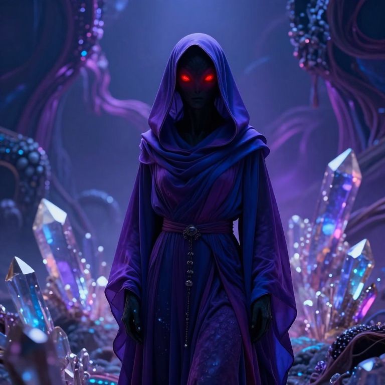 A mesmerizing digital composition depicts an enigmatic figure draped in rich hues of purple and blue robes as they stand amidst luminescent crystals under an otherworldly neon sky. The figure's hood shrouds their face, but fiery red eyes pierce through the darkness, hinting at a hidden alien essence. This surreal scene, reminiscent of an unknown extraterrestrial landscape, seamlessly blends organic forms with synthetic elements to create a hauntingly beautiful yet unsettling atmosphere that invites the viewer into its mysterious realm.